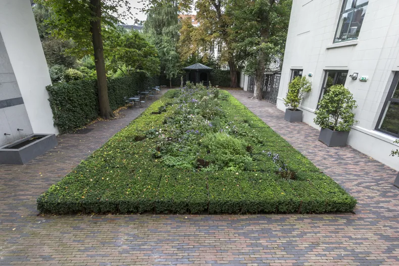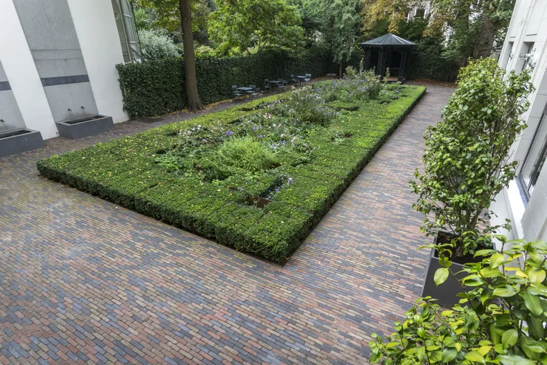 Pour donner au jardin l’aspect souhaité, Michael van Gessel a dessiné un jardin classique dans l’esprit de Hans Vredeman de Vries. Ainsi, il a imaginé un parterre de fleurs central entouré d’une haie de buis aux lignes épurées, un motif clairement visible depuis le bel-étage du bâtiment.