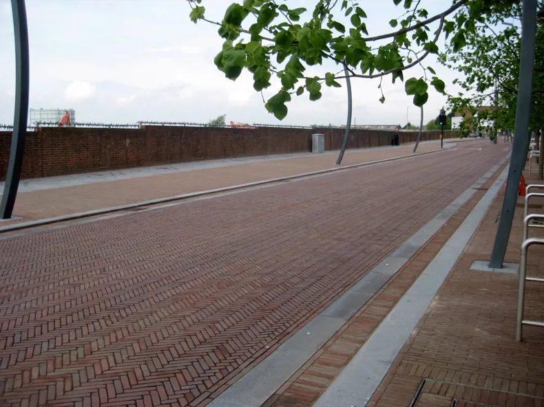 Afin de limiter la vitesse, on enlève les panneaux de signalisation et le marquage au sol tout en réduisant la largeur de la chaussée. Pour ce faire, le béton fut dans ce cas remplacé notamment par le pavé en terre cuite DecimA Amarante. Ces changements augmentent le degré d’attention des conducteurs, qui tiennent davantage compte de leur entourage global.