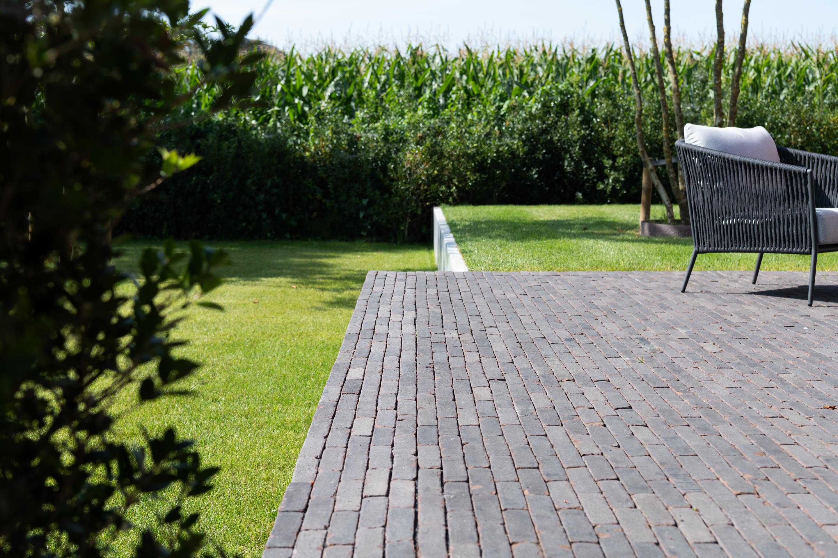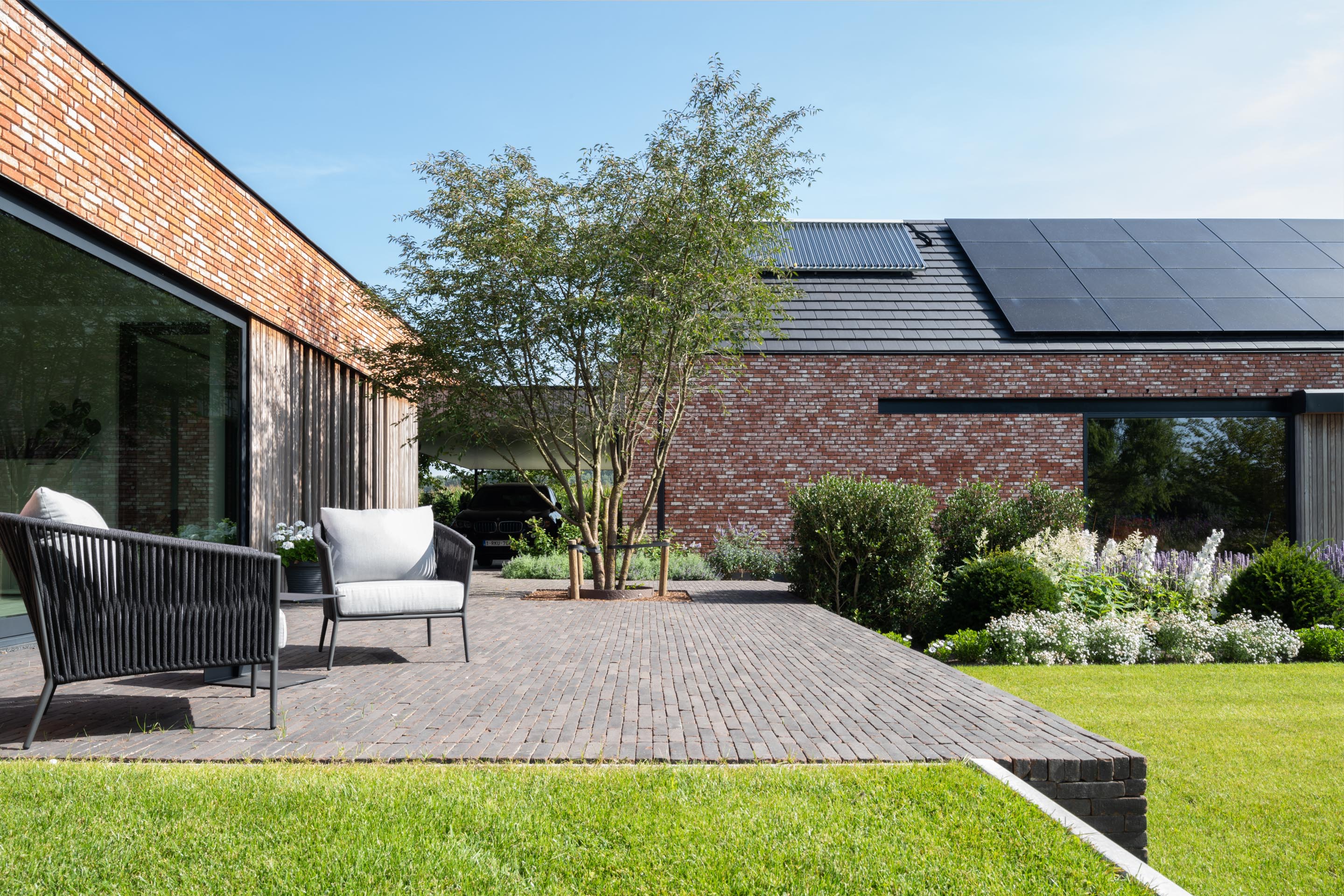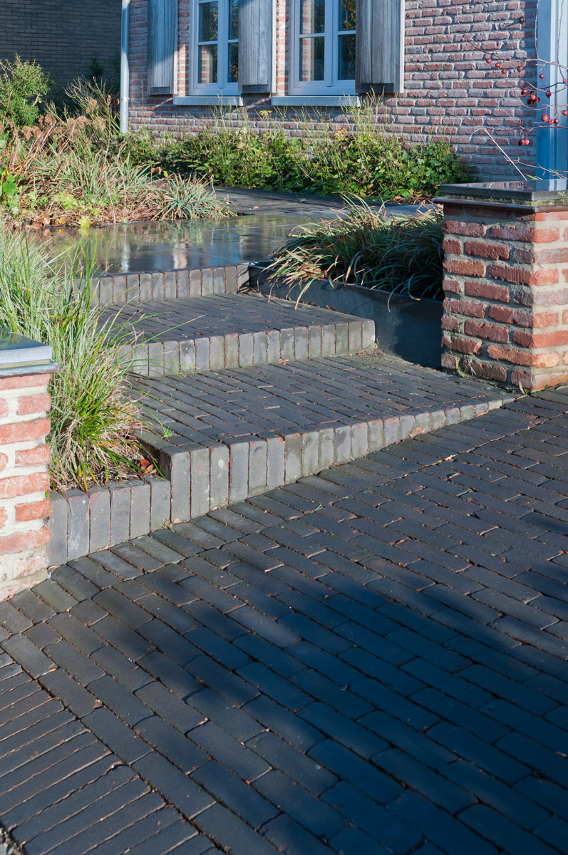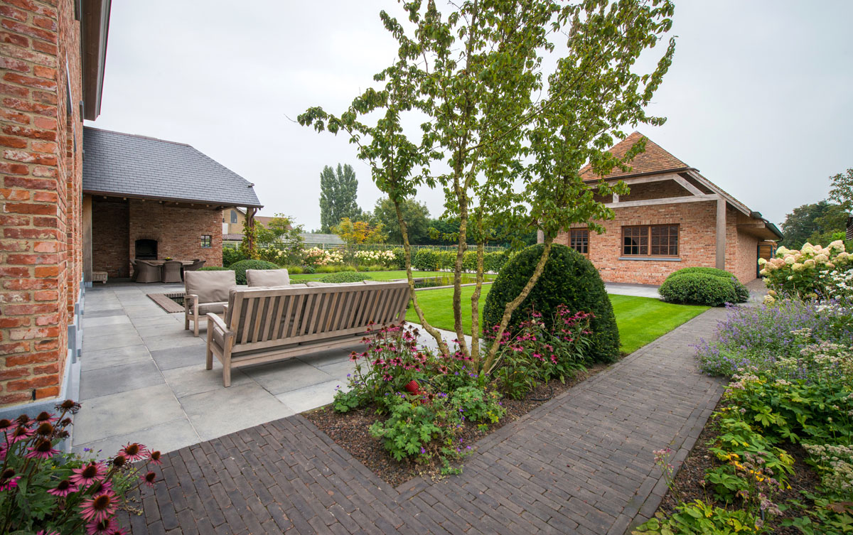 En utilisant des pavages et de la végétation structurante, l’entrepreneur de jardins Gert Kwanten a modelé un jardin apaisant entourant une imposante habitation dans le style manoir.