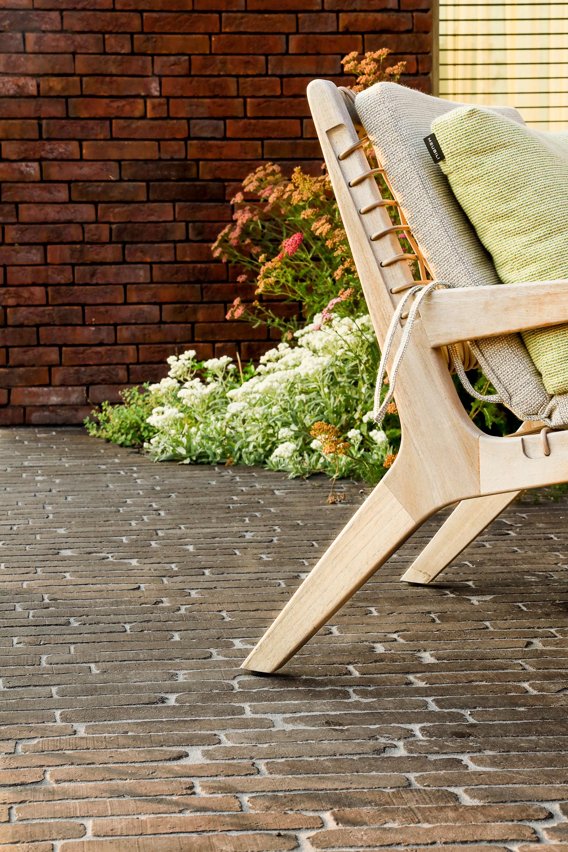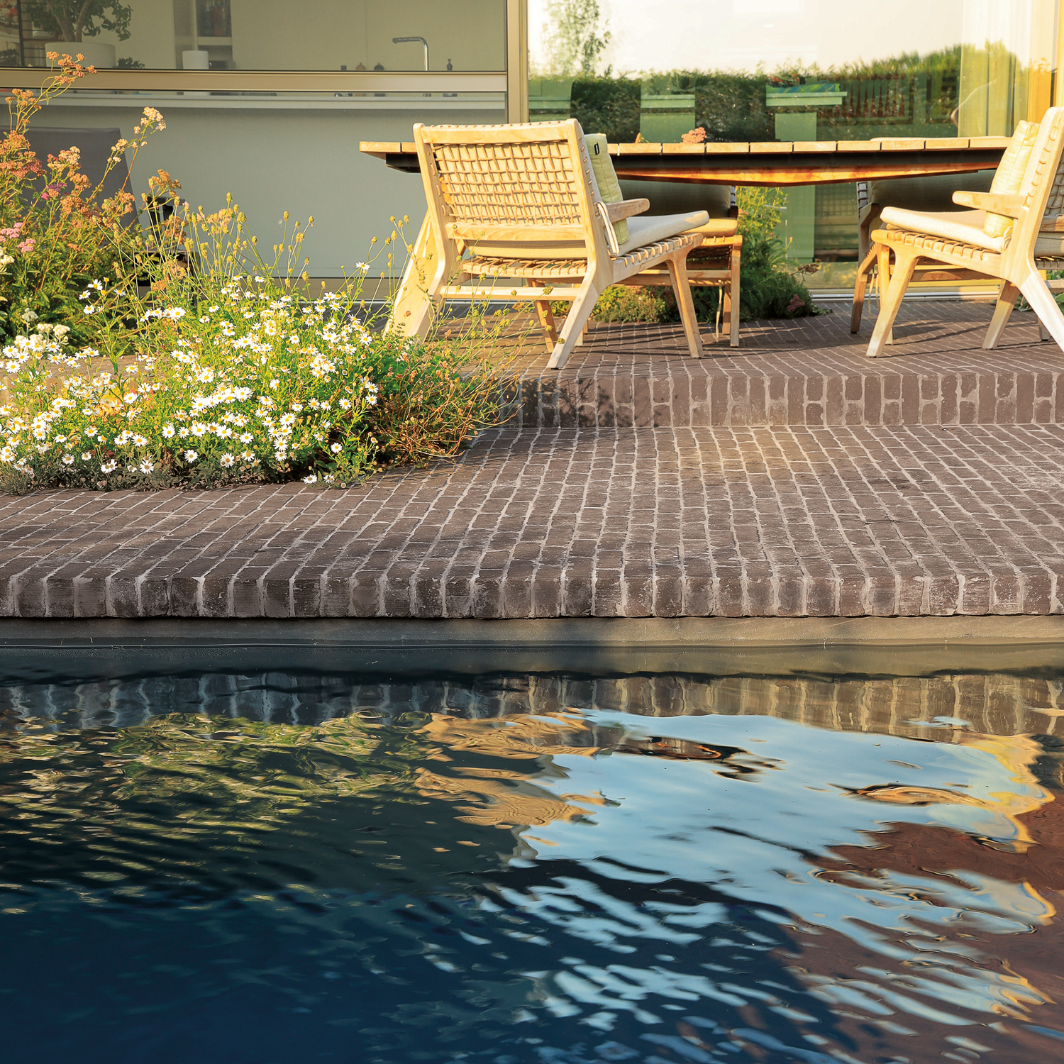 De par leur exceptionnelle dureté, les pavés en terre cuite peuvent également être nettoyés au jet d'eau sans risque de perte de couleur et de texture, si nécessaire en ajoutant des produits de nettoyage respectueux de l'environnement. Gardez une distance suffisante et évitez un jet ponctuel sur des pavés en terre cuite sablés. Les pavés en terre cuite sont résistants à la plupart des produits de nettoyage chimiques.