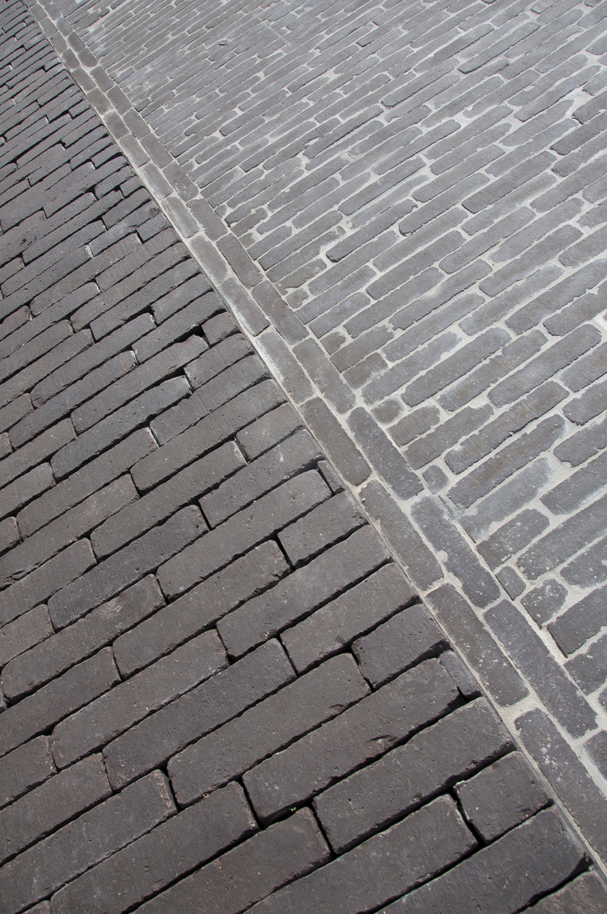 Les pavés en terre cuite sont placés librement les uns contre les autres avec un joint minimum (2 à 3 mm) par la méthode du click & drop. En tapant d'abord les pavés ensemble puis en les abaissant sur la couche de pavage, l'épaisseur correcte du joint est automatiquement atteinte et la couche de pavage reste intacte. Si nécessaire, un joint légèrement plus large peut être utilisé de temps en temps afin de maintenir l'appareillage souhaités. Il est fortement déconseillé de presser les pavés les uns contre les autres afin d'éviter d'endommager les bords.