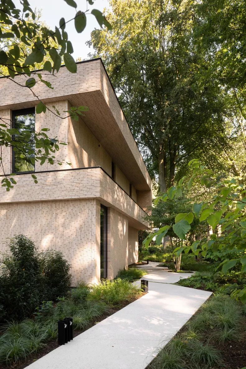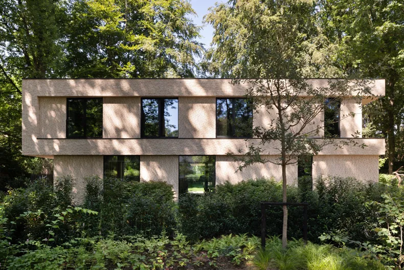 Le bâtiment en forme de L et le jardin rayonnent d'harmonie et de quiétude. Cet effet est créé, entre autres, par le choix de la couleur des matériaux et le jeu de relief. La façade de teinte beige est entièrement constituée de plaquettes horizontales et verticales, un choix conscient pour ne pas perturber le paysage. Pour cette maison, nous avons choisi la plaquette linea 9001, un format élégant et allongé dans une teinte sable. Les briques de parement ont été placées alternativement horizontalement et verticalement en maçonnerie pour une subtile touche ludique.
