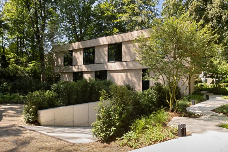 Une grande partie du jardin est située en zone forestière officielle. C'est pourquoi des plantes et des arbres indigènes spécifiques ont été réservés ici parmi les arbres existants. Les résidents peuvent profiter d'une agréable promenade dans cette richesse végétale le long d'un chemin. Du point le plus éloigné du jardin, on aperçoit clairement la forme intime en L qui embrasse le jardin et la terrasse. Les auvents fonctionnent comme une protection solaire, mais créent également sécurité et dynamisme. Le jardin reçoit beaucoup de soleil et de lumière du jour, mais le coin salon doté de beaux meubles design reste à l'ombre. Grâce aux nombreux grands arbres, on sent à peine un souffle de vent ici. La terrasse se compose également de deux niveaux et abrite une belle piscine avec des détails en pierre naturelle. En raison de techniques spéciales pour les piscines, le chlore n'est pas nécessaire ici. Même les écureuils viennent boire cette eau pure. Les mouvements ondulatoires des dénivelés confèrent une dynamique caractéristique tant à l'avant qu'à l'arrière, mais aussi à côté. Sous la villa, un sous-sol spacieux de 171 m² sert de garage et d'espace pour toute la technologie, soigneusement dissimulé derrière de grandes armoires murales noires.