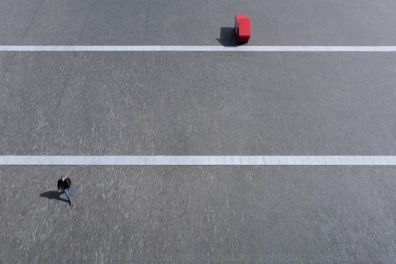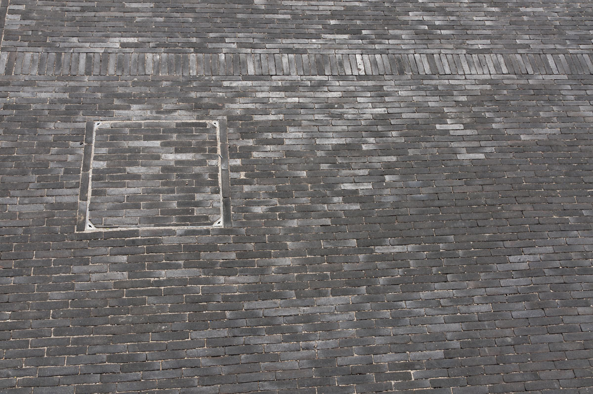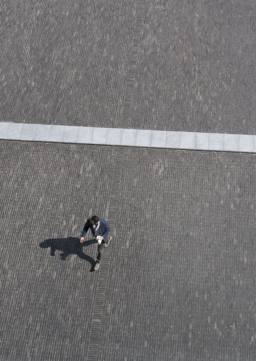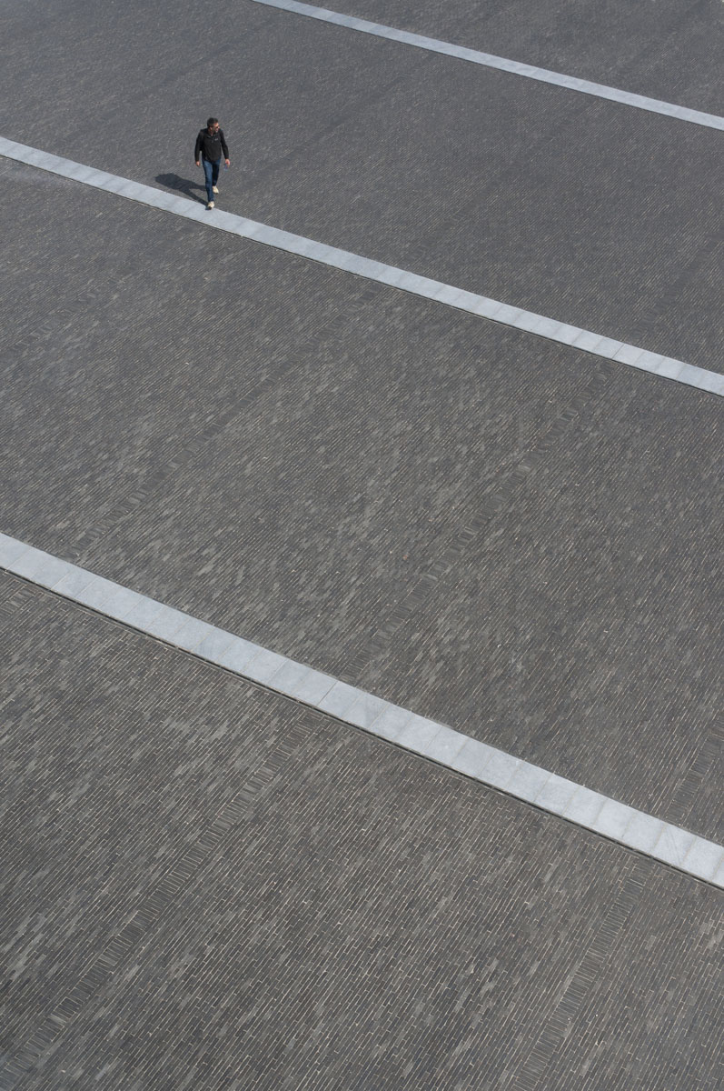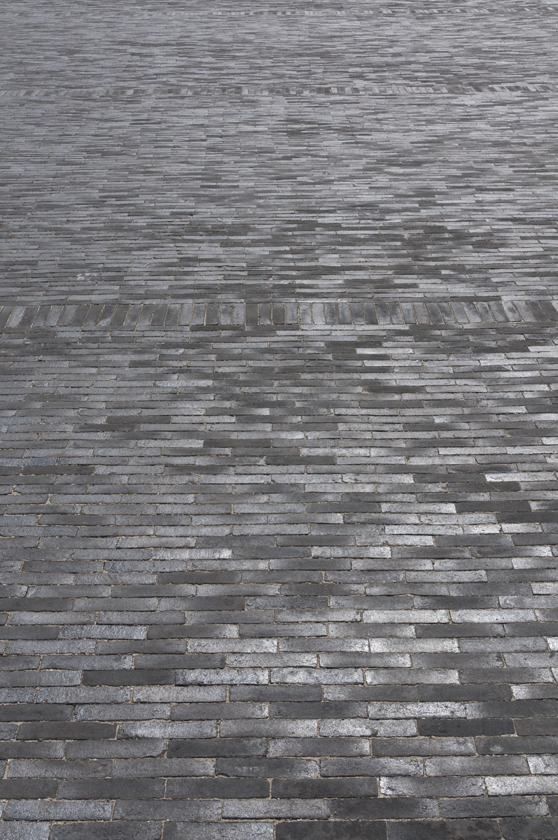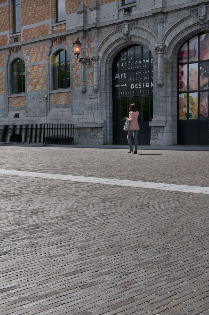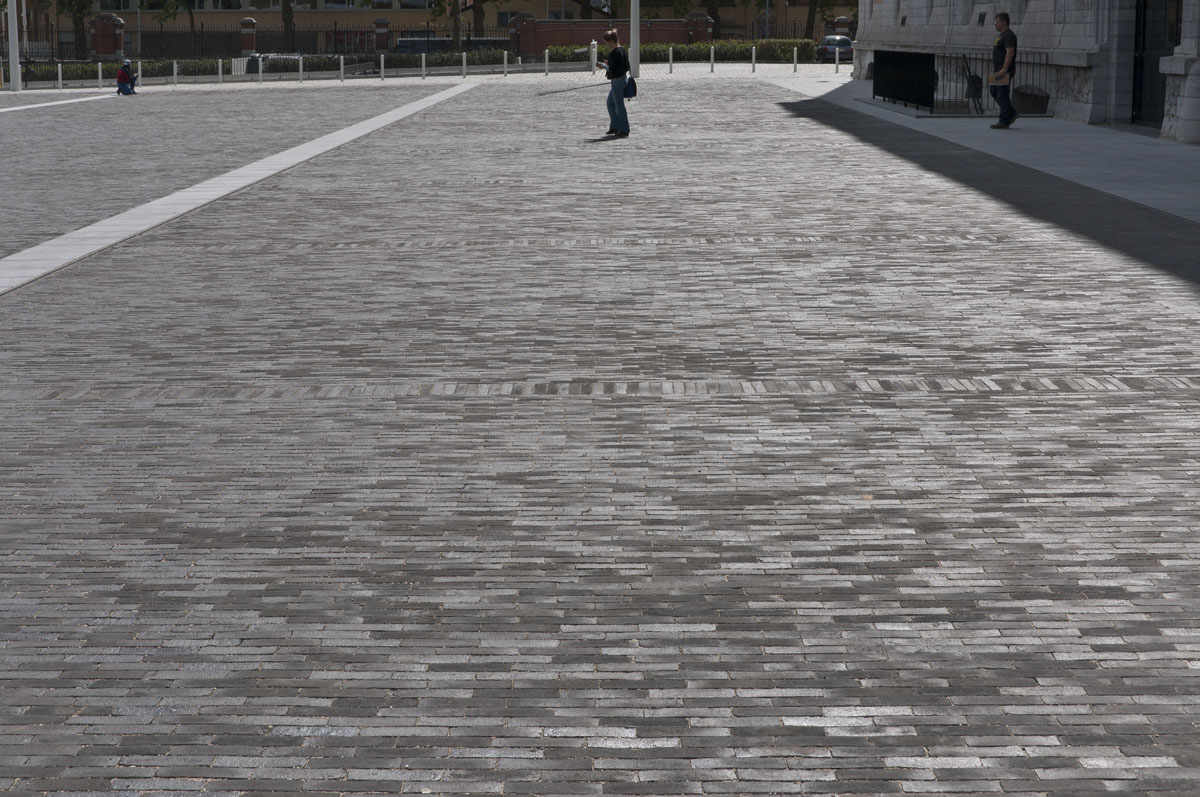 Les bandes de pierre bleue accentuent l’impression d’espace perceptible quand on flâne sur la place.