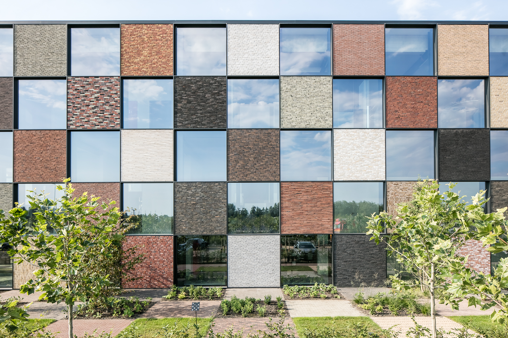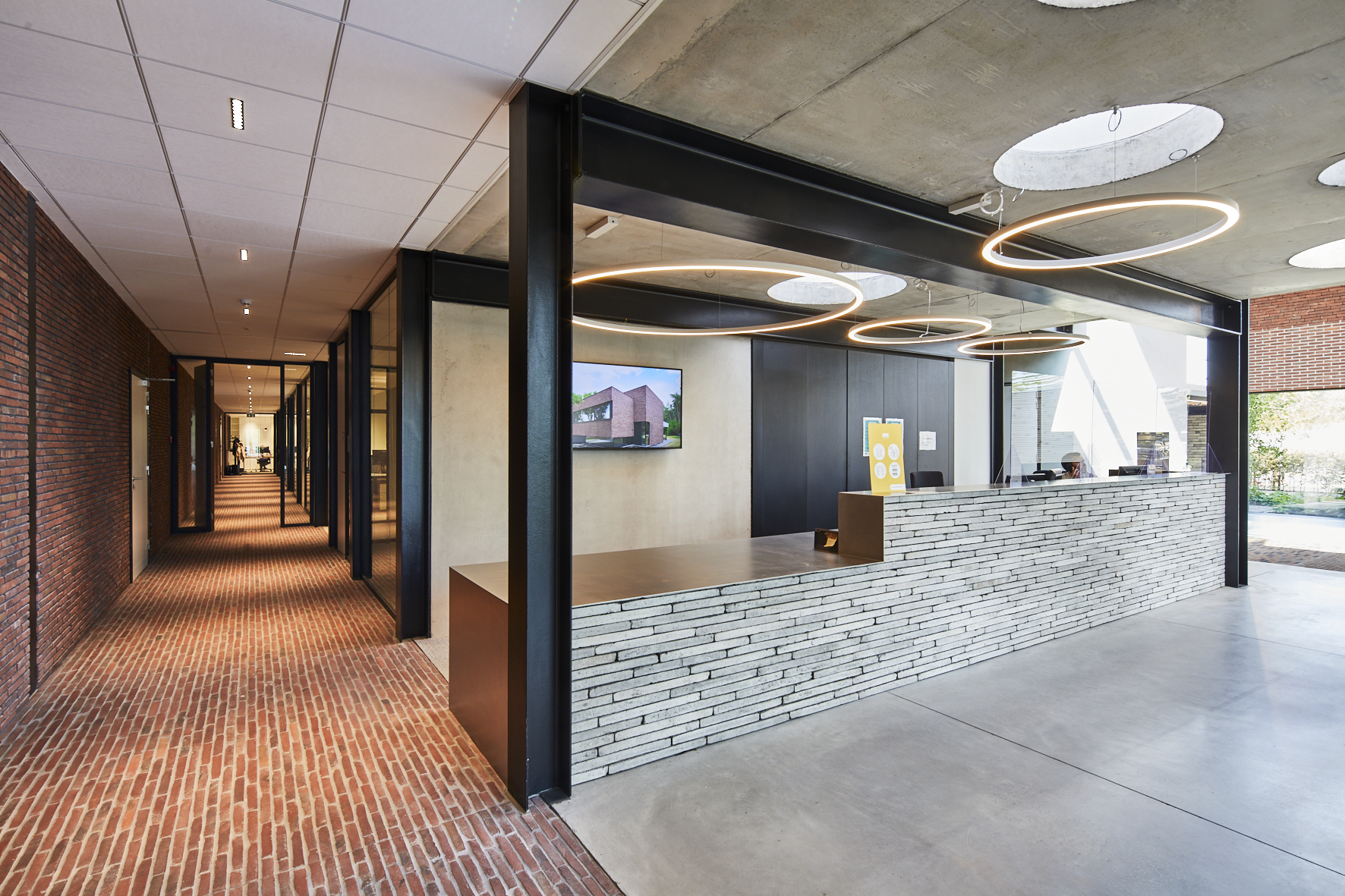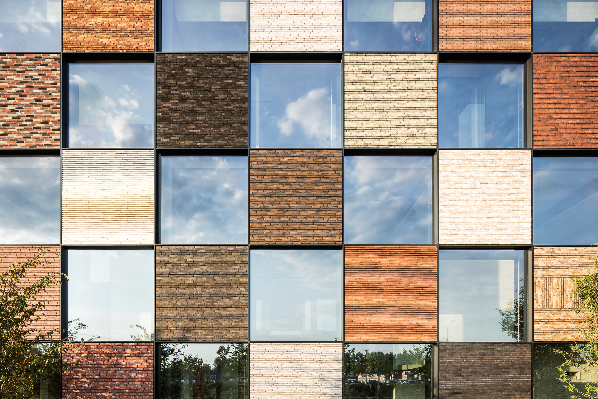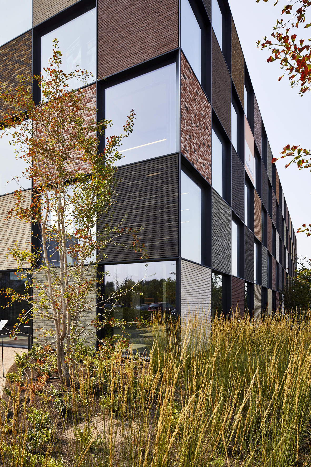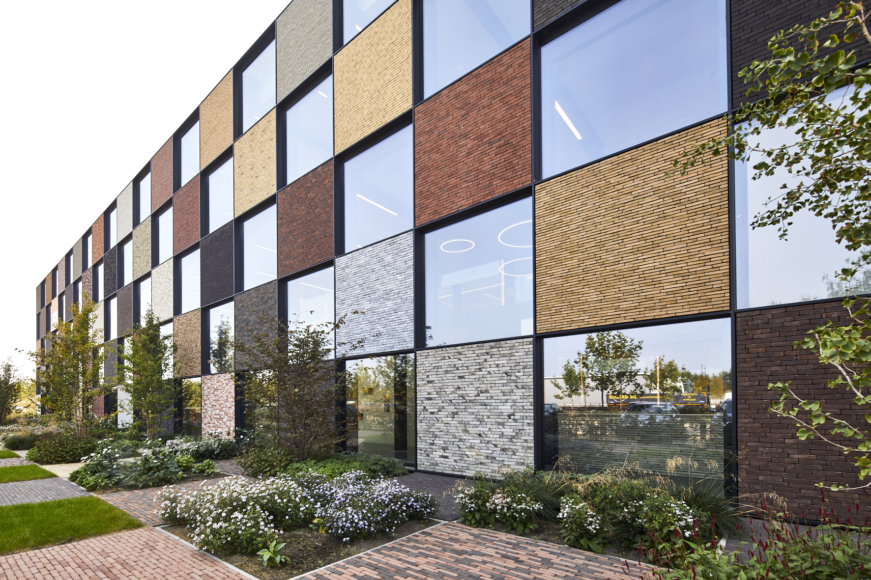 Pour laisser s’exprimer pleinement toutes les parties en briques ou pavés, la sobriété dans l’association avec d’autres matériaux et couleurs a été privilégiée. Béton, verre et acier laqué noir reviennent le plus souvent et soulignent de matière optimale les surfaces en briques et en pavés. « Un projet industriel avec le sens du détail, dans lequel la sincérité de la conception et des matériaux est clairement visible, de telle sorte que l’intégration urbanistique et architecturale au contexte attire l’attention sur le produit brique et pavé en terre cuite. » (Thierry De Vos, architecte)