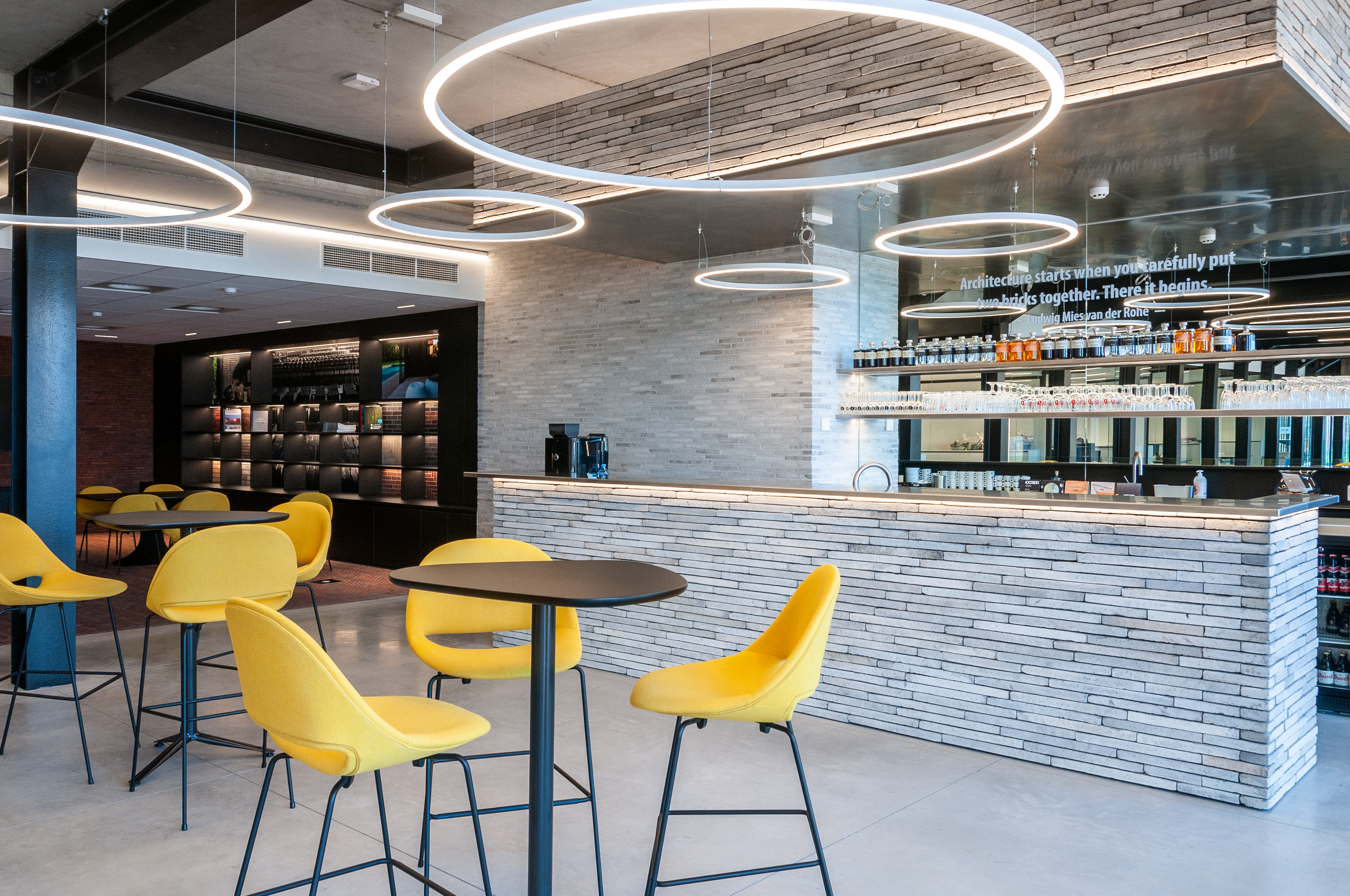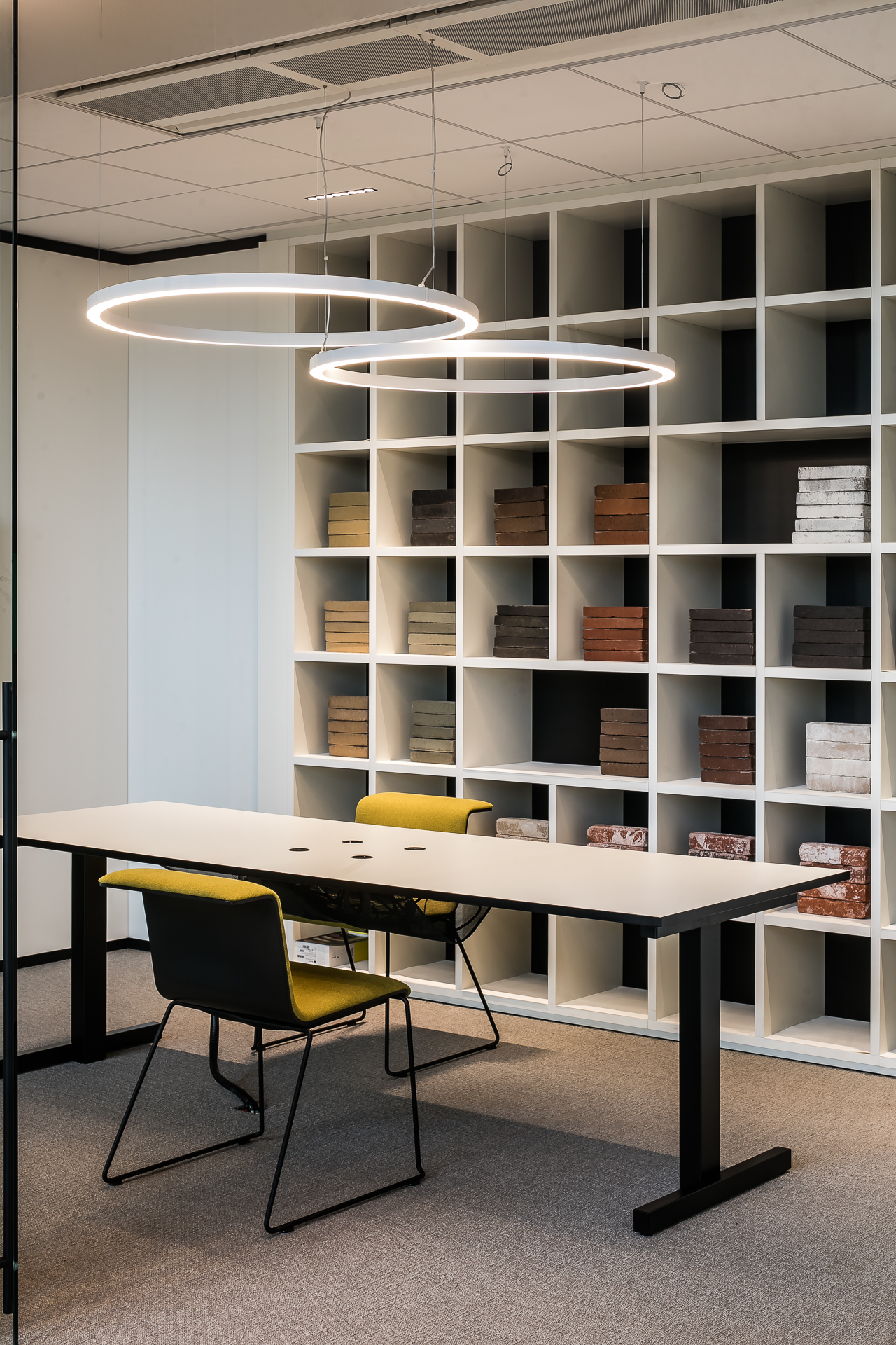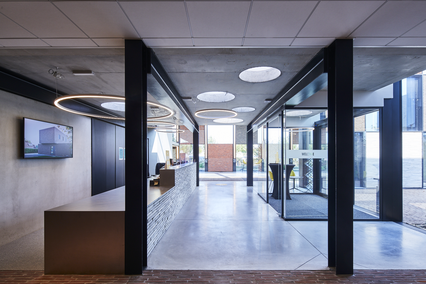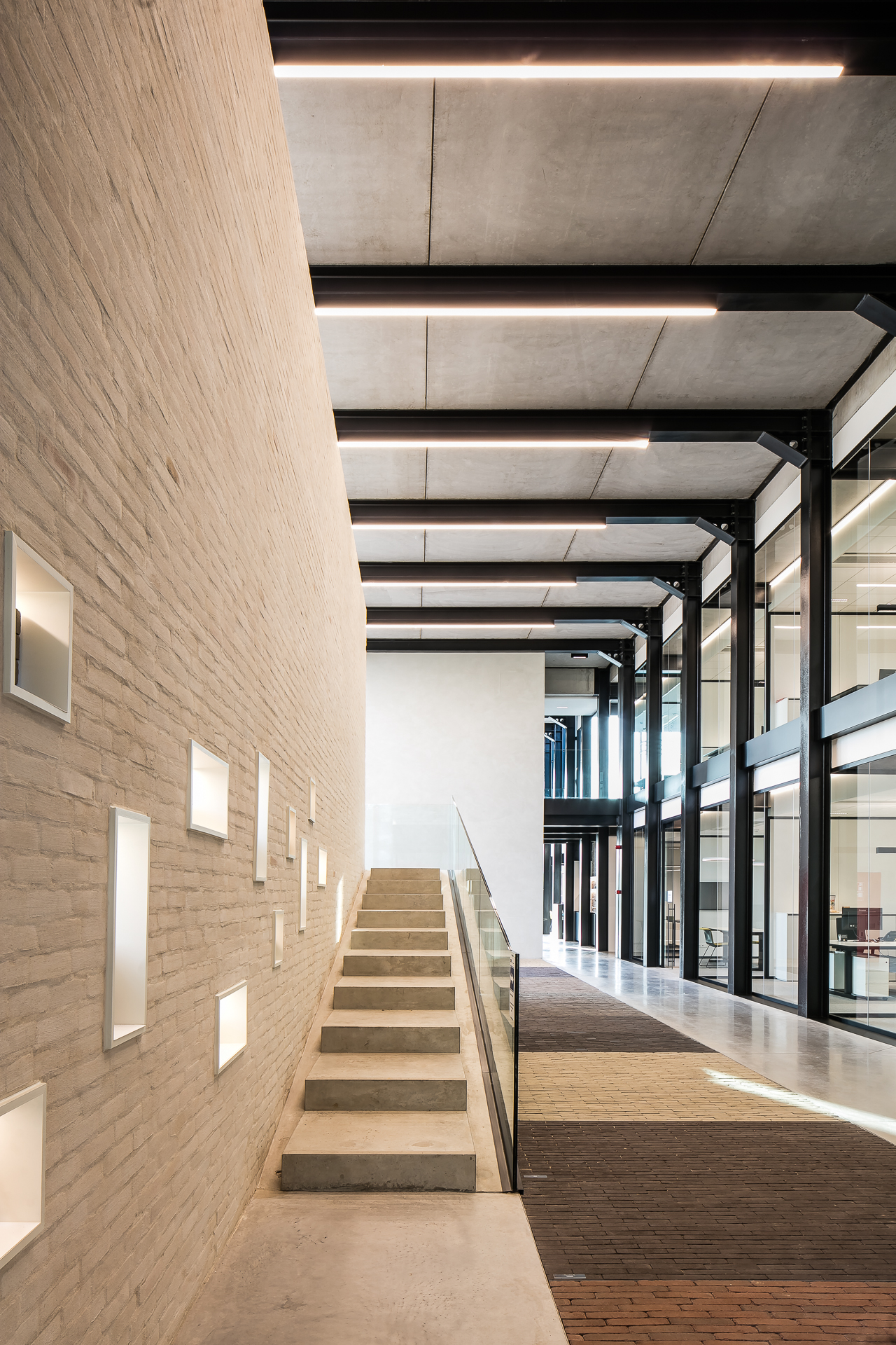 Pour laisser s’exprimer pleinement toutes les parties en briques ou pavés, la sobriété dans l’association avec d’autres matériaux et couleurs a été privilégiée. Béton, verre et acier laqué noir reviennent le plus souvent et soulignent de matière optimale les surfaces en briques et en pavés. « Un projet industriel avec le sens du détail, dans lequel la sincérité de la conception et des matériaux est clairement visible, de telle sorte que l’intégration urbanistique et architecturale au contexte attire l’attention sur le produit brique et pavé en terre cuite. » (Thierry De Vos, architecte)
