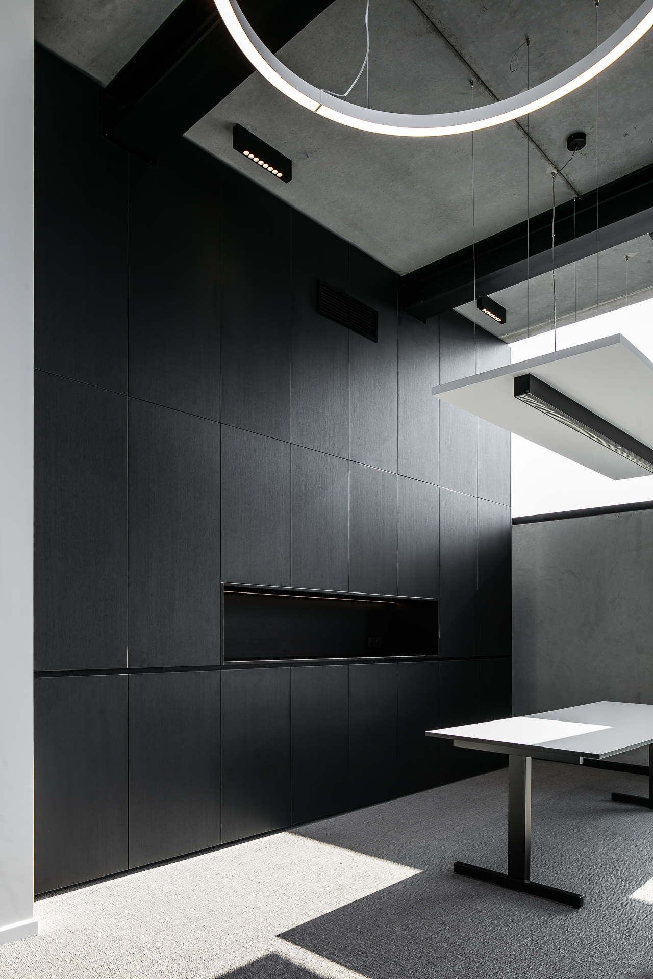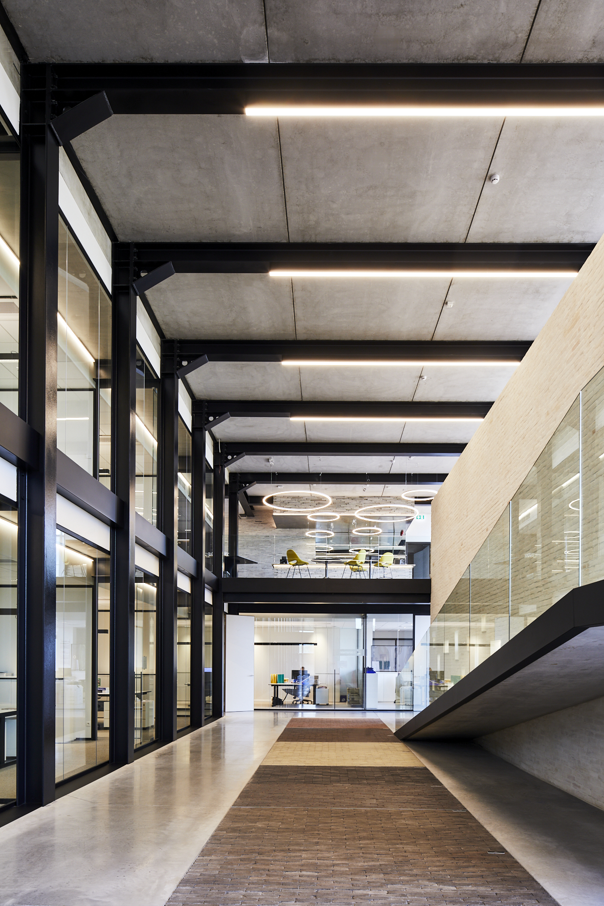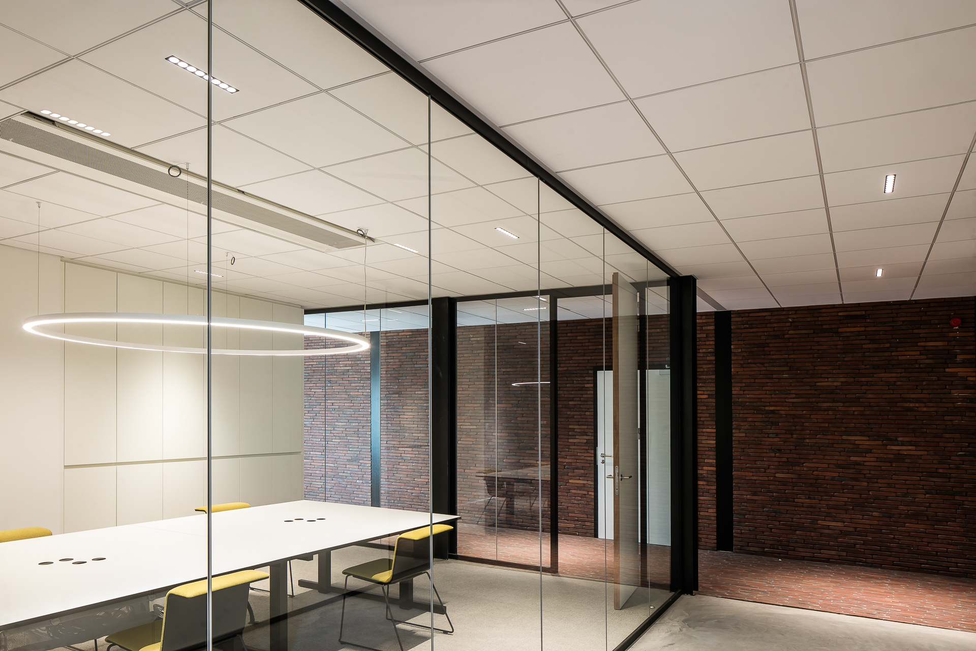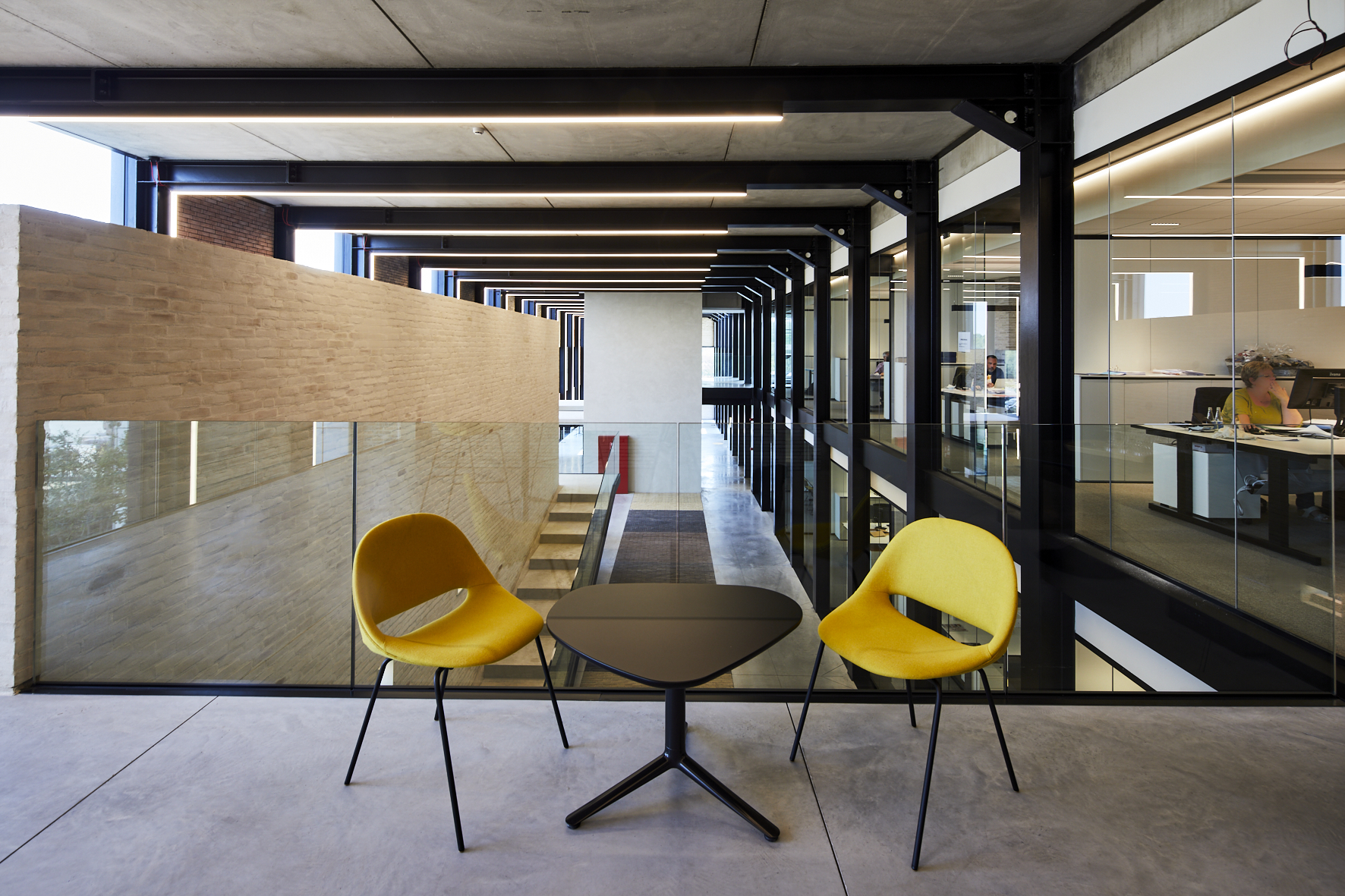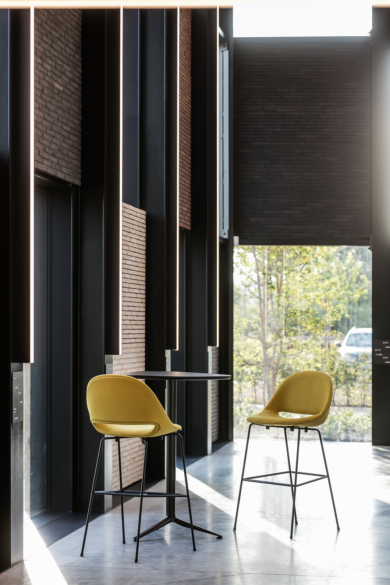 Pour laisser s’exprimer pleinement toutes les parties en briques ou pavés, la sobriété dans l’association avec d’autres matériaux et couleurs a été privilégiée. Béton, verre et acier laqué noir reviennent le plus souvent et soulignent de matière optimale les surfaces en briques et en pavés. « Un projet industriel avec le sens du détail, dans lequel la sincérité de la conception et des matériaux est clairement visible, de telle sorte que l’intégration urbanistique et architecturale au contexte attire l’attention sur le produit brique et pavé en terre cuite. » (Thierry De Vos, architecte)