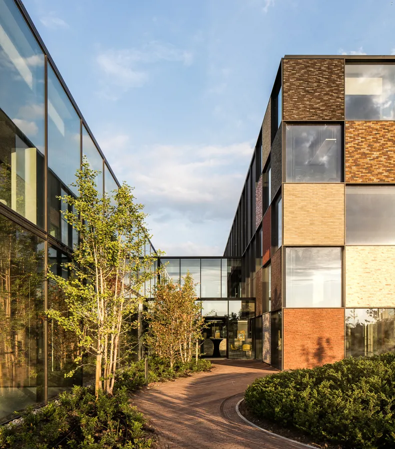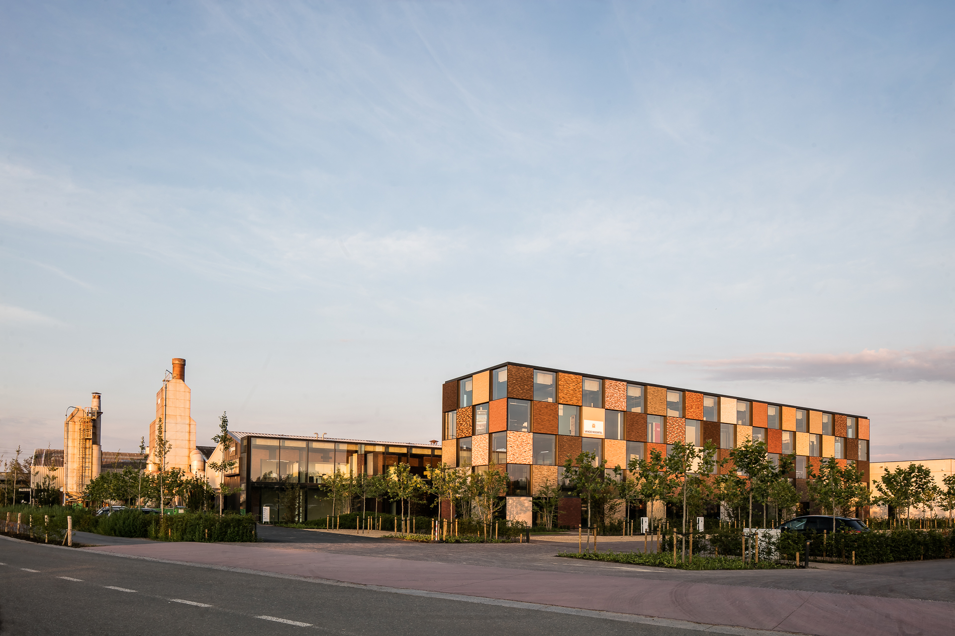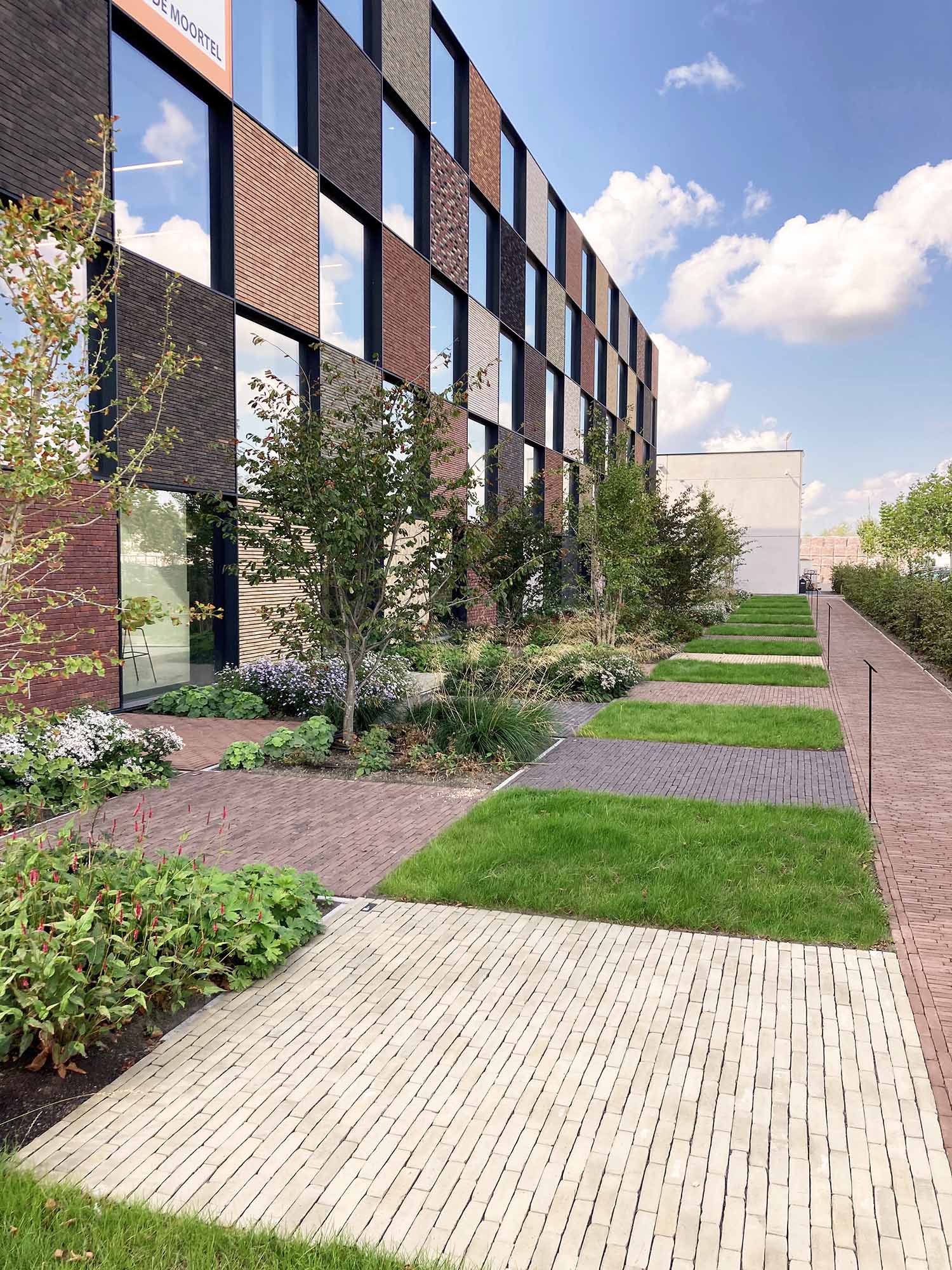 « Par sa fonction, ce genre de terrains industriels est souvent fort nu et peu attrayant. En combinant de nombreux arbres et autres végétaux avec un matériau de pavage naturel comme des pavés en terre cuite, nous sommes parvenus à créer un ensemble agréable et apaisant. Nous avons ainsi volontairement choisi des teintes brunes et jaunes. Celles-ci se marient bien avec les arbres et arbustes choisis pour créer un ensemble cohérent. Même la voie d’accès très fréquentée vers la zone de stockage se fond dans l’ensemble. Tout cela résulte en une réalisation à la pointe de la durabilité, encore renforcée par l’attention que nous avons apportée à l’infiltration des eaux de pluie et à l’emploi de matériaux circulaires. » (Martin Wirtz, architecte paysager)