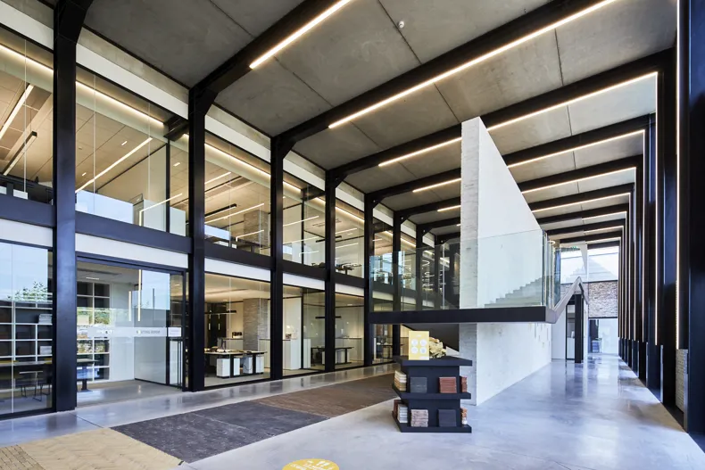 Le bâtiment abritant le showroom, partie intégrante de la composition architecturale des volumes et fonctions, a été conçu comme un concept store, avec la fonctionnalité comme point de départ. C’est là qu’est pilotée la production de briques de parement et pavés en terre cuite et que sont accueillis les différents acteurs des projets dans lesquels ces produits sont utilisés. Au premier regard, on comprend ce que le bâtiment abrite et ce que l’on peut attendre de la visite. Lors de la réalisation du bâtiment, les architectes ont mis le produit et la gamme au centre de leur travail. Ils ont ensuite interrogé leurs propres attentes par rapport à la visite d’une briqueterie.