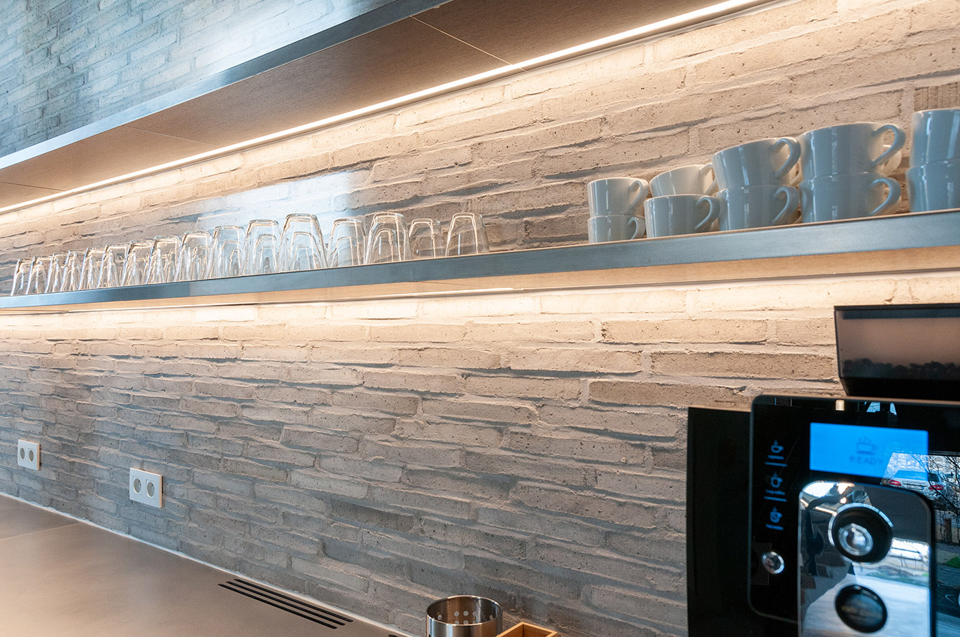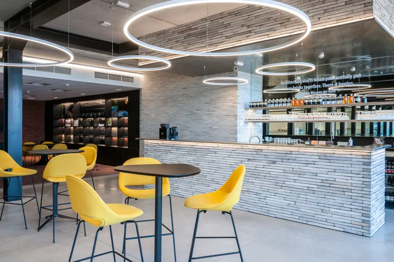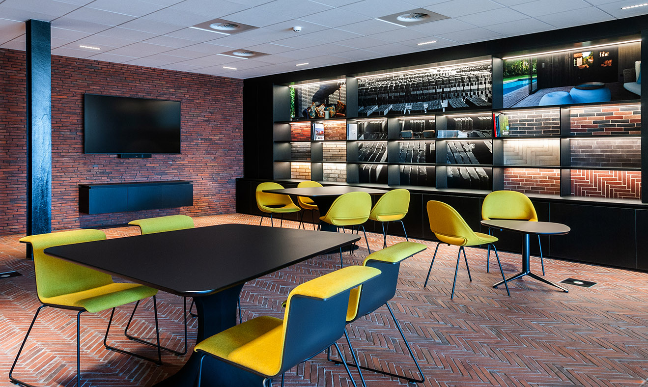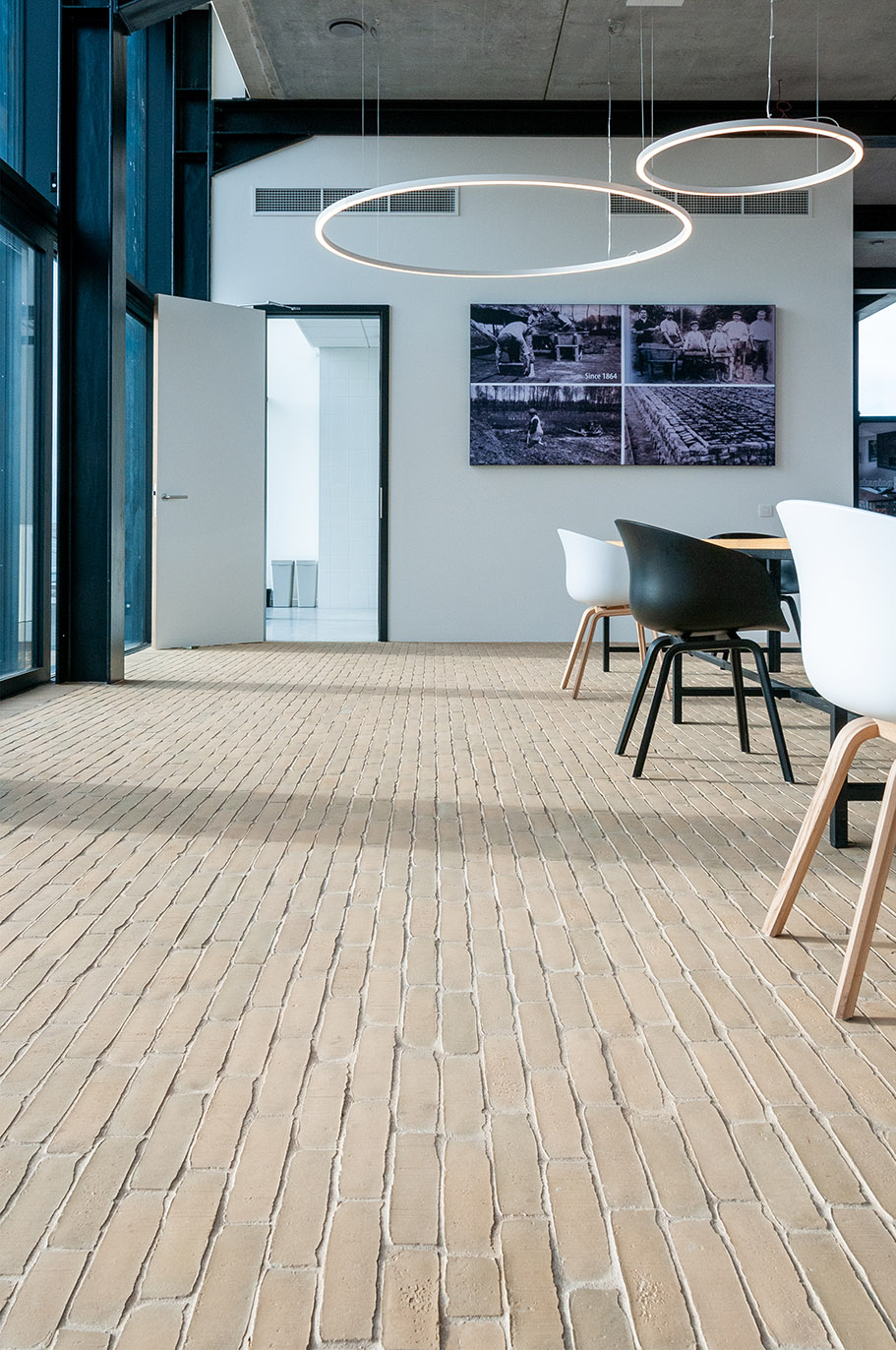 Le nouveau bâtiment ne se contente pas de présenter la gamme complète des produits, il affiche aussi la diversité dans l’utilisation des briques de parement et pavés en terre cuite. Tous deux font ces dernières années de plus en plus leur retour dans les espaces intérieurs, où ils sont mis en œuvre suivant une grande variété de techniques.