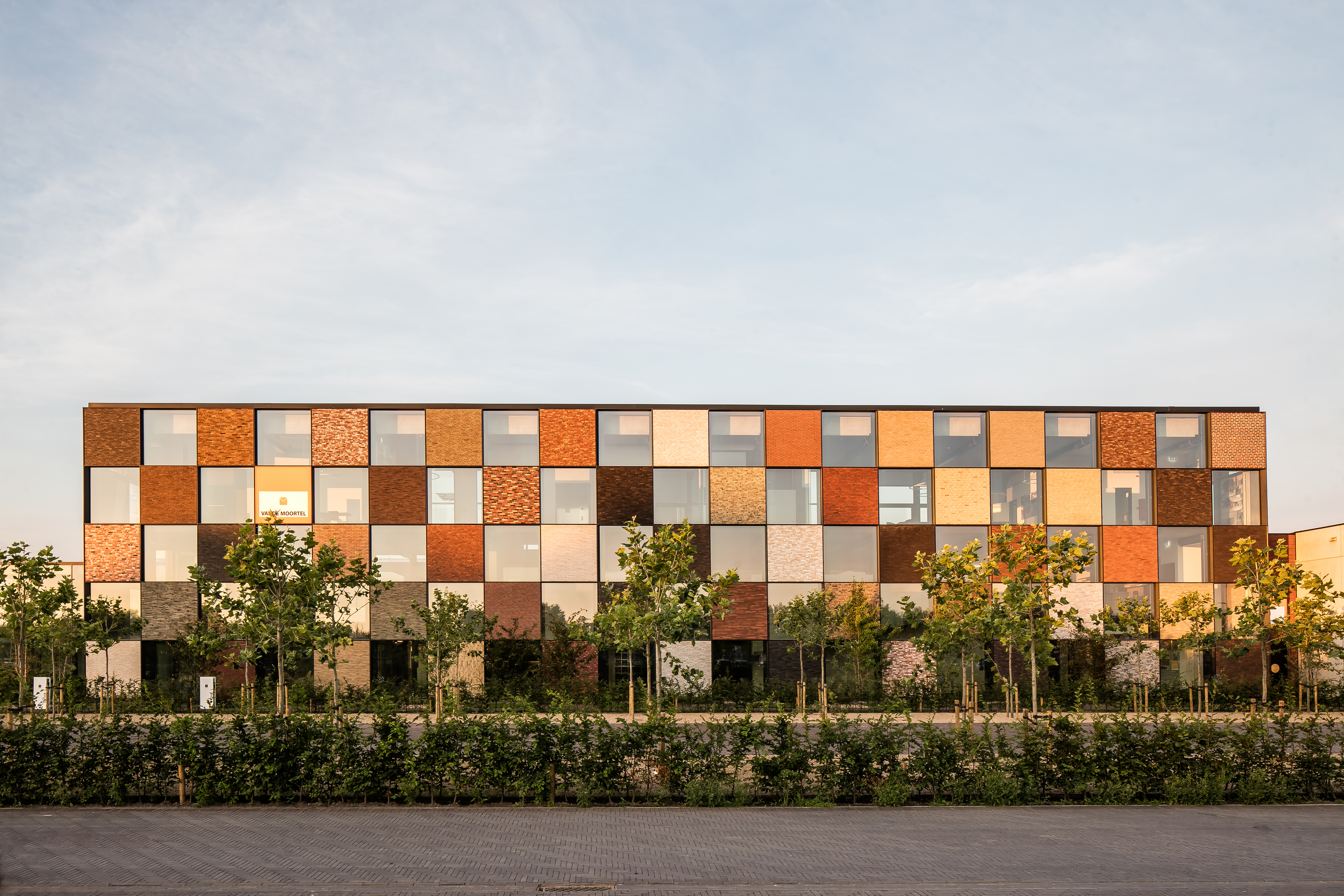 « La briqueterie Vande Moortel est implantée sur un site fantastique, entre d’anciens hangars le long de l’Escaut. L’idée était de construire un entrepôt au bord de l’eau. Un repère que l’on voit de loin et qui affiche clairement son identité. Nous avons opté pour une forme rectangulaire épurée et une ossature en acier, sur une trame de 2,5 m, pour accentuer l’impression d’architecture portuaire. Ce bâtiment est appelé à devenir un véritable point de repère dans la région. » (Thierry De Vos, architecte)