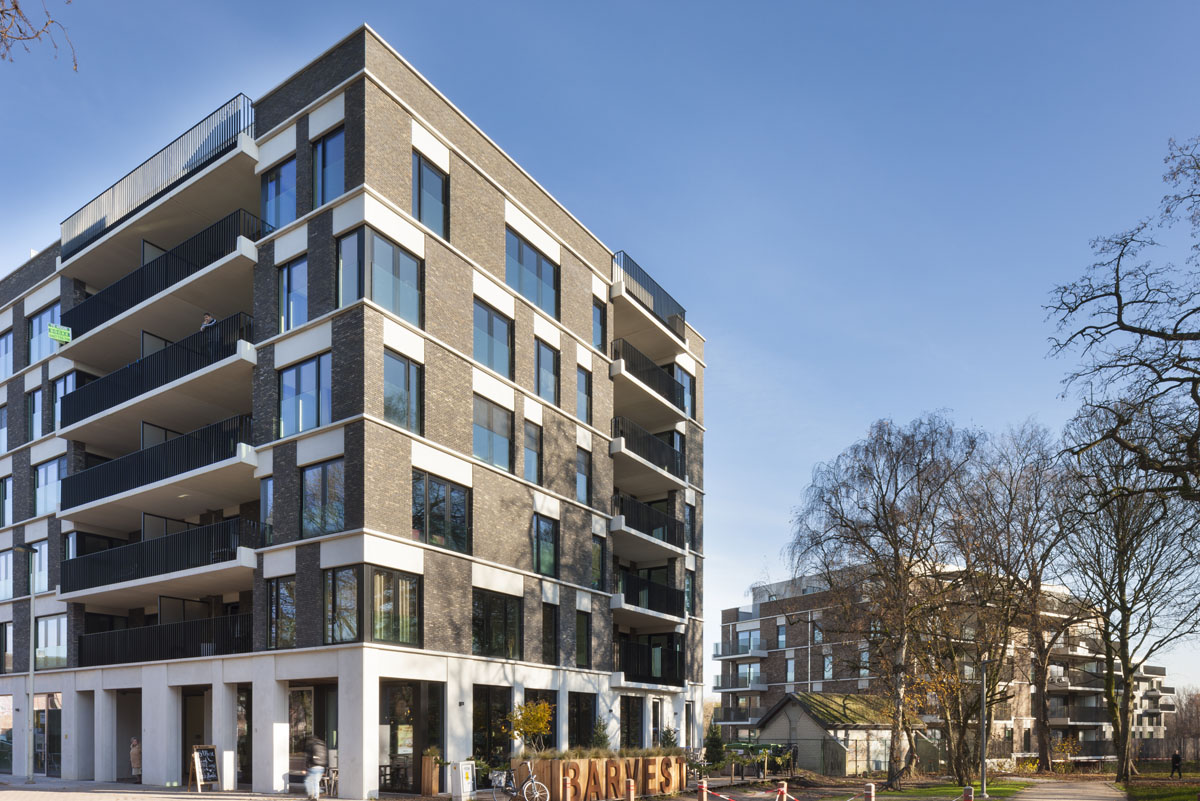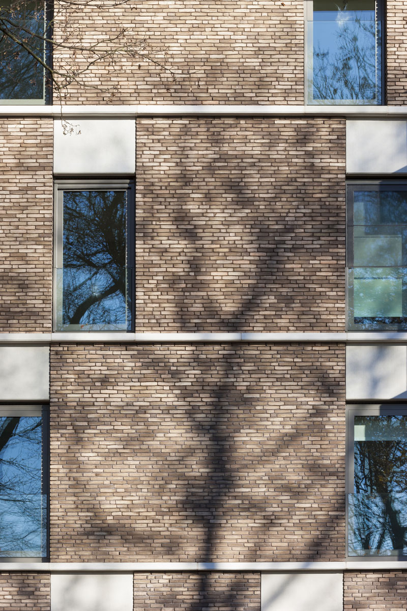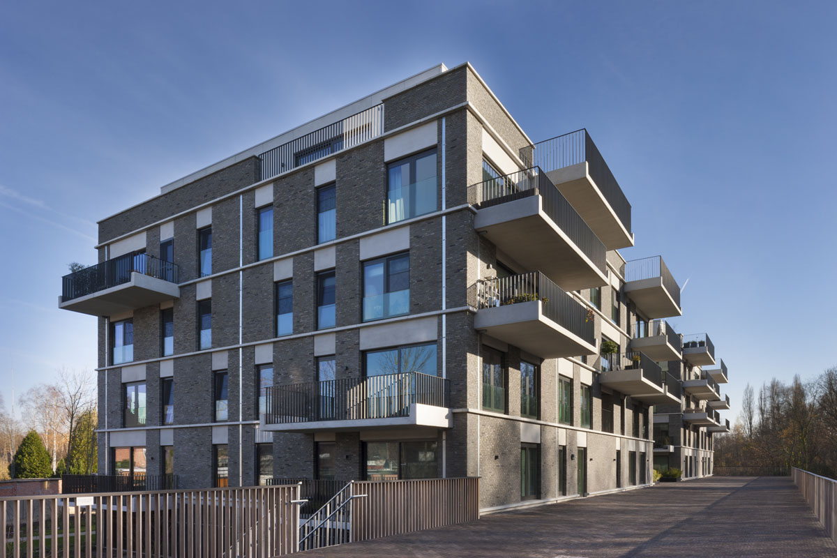 Ils sont reliés entre eux par une large allée piétonne, réalisée avec des pavés en terre cuite de couleur anthracite de Vande Moortel, et sous laquelle se trouve un vaste garage souterrain. Les abords sont conçus comme un parc, donnant au projet une connexion parfaite avec les fortifications vertes environnantes.