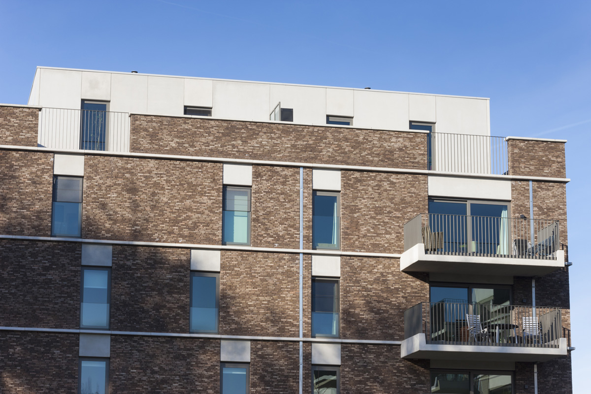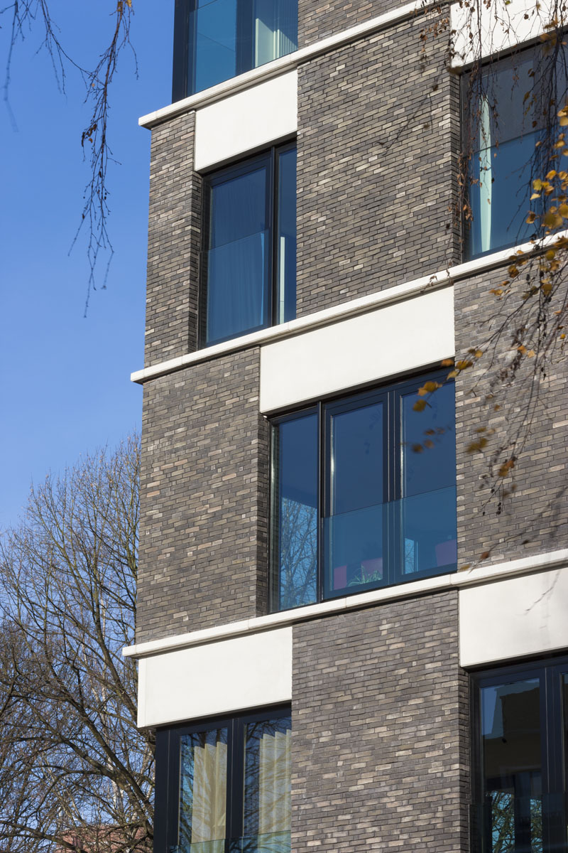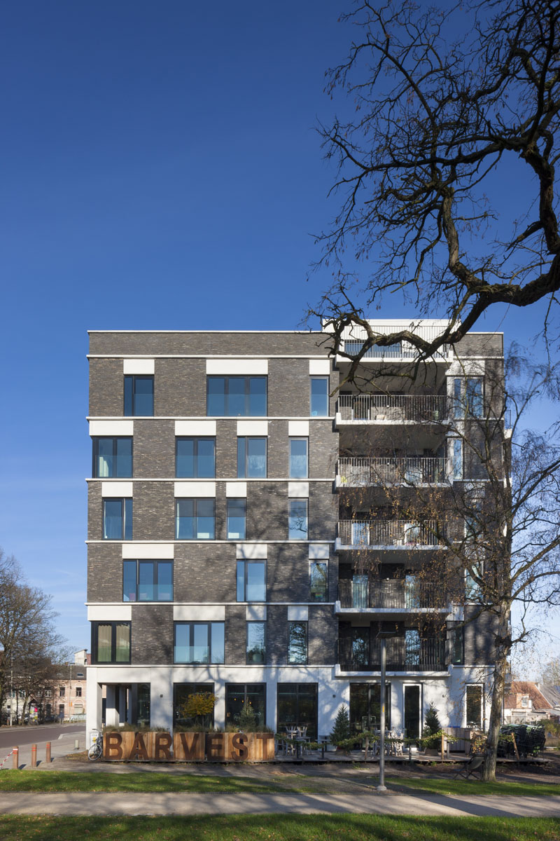 Grâce à un choix de matériaux judicieux et à quelques petites différences visuelles, chaque volume reçoit une identité propre correspondant à sa localisation exacte sur le site. Le bâtiment d’entrée s’inspire du contexte plus urbain. Avec son socle orienté vers l’espace public, ses sept niveaux, ses terrasses intégrées et ses nuances de maçonnerie gris-noir, il fait office de repère.