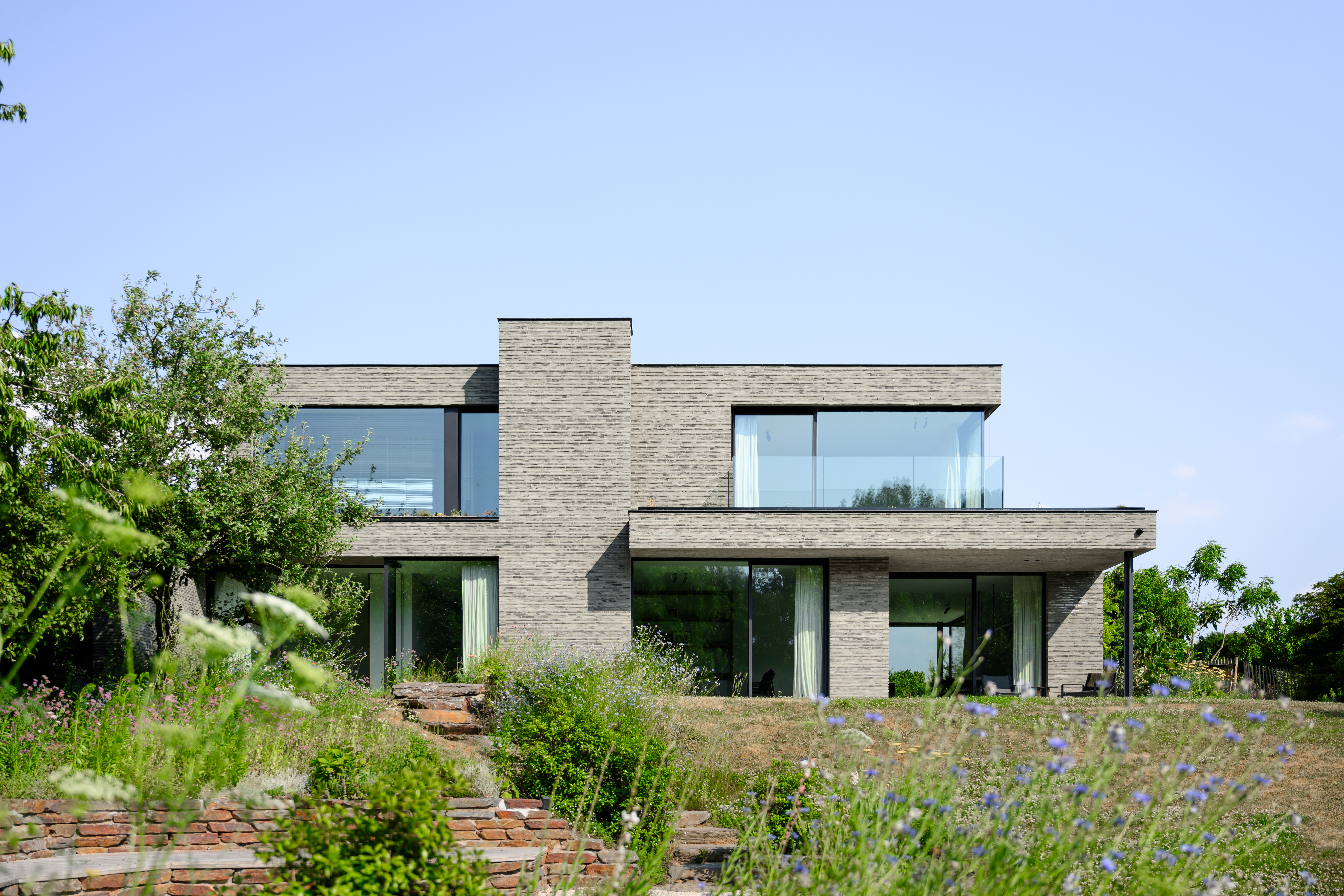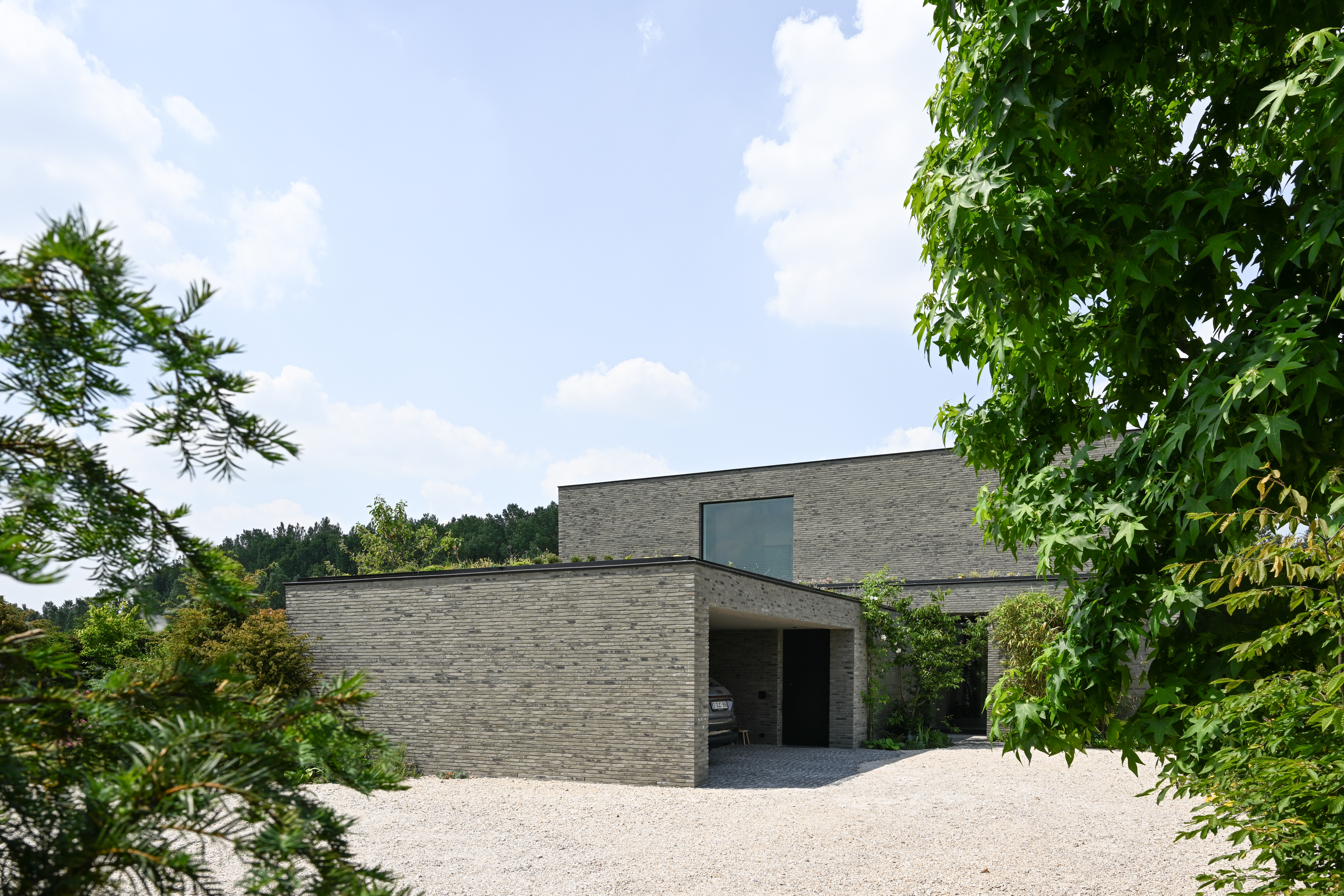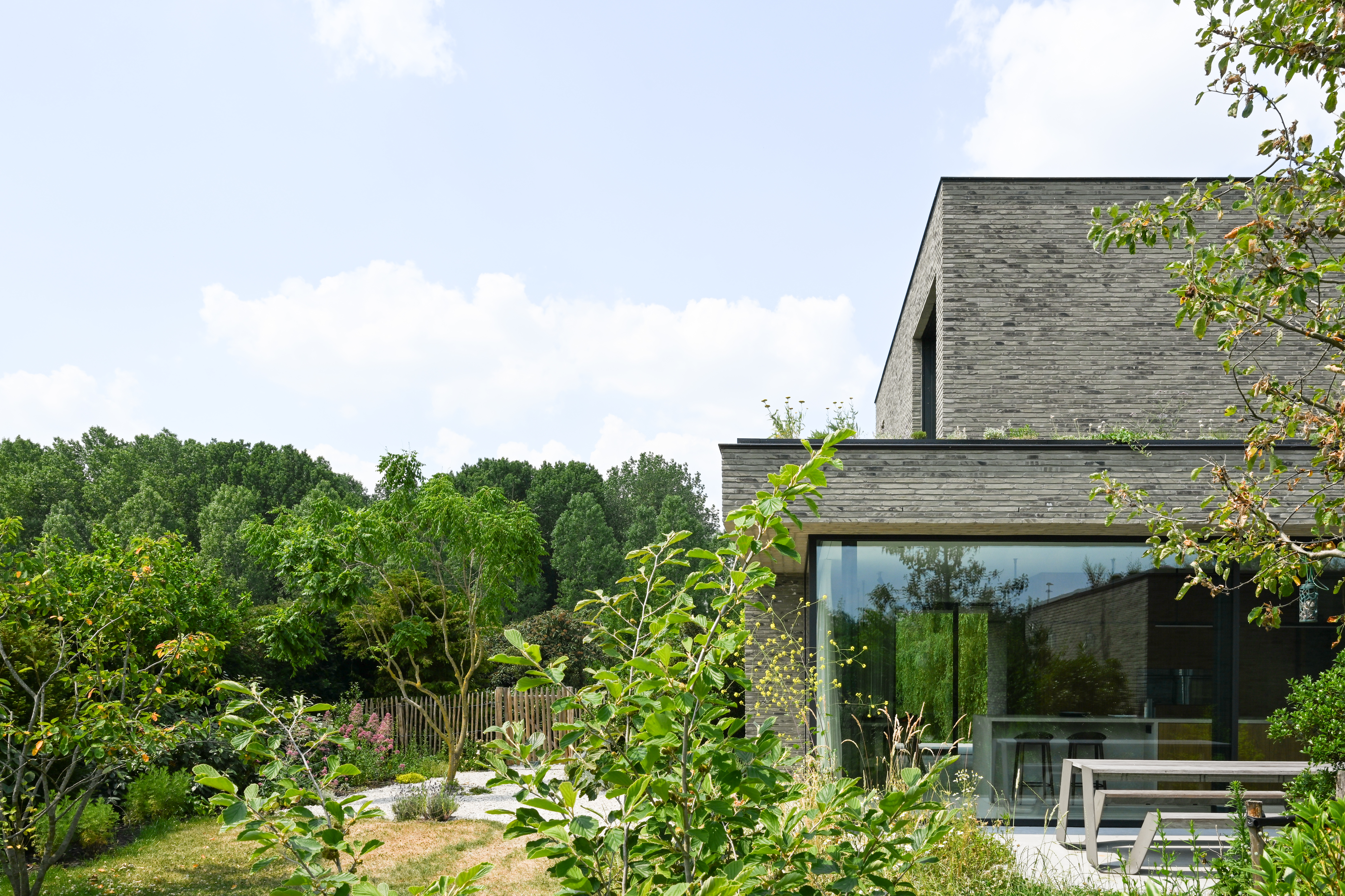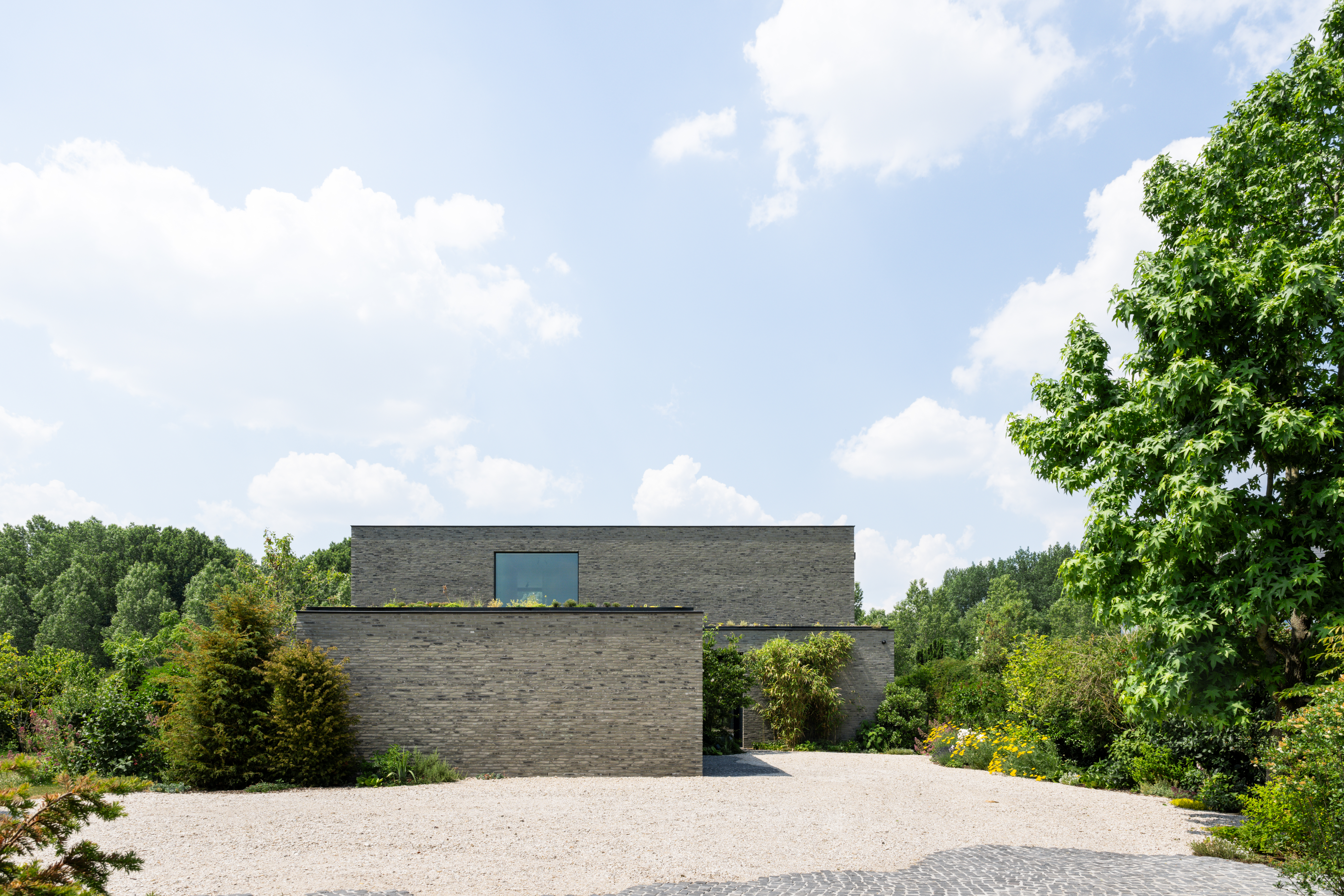 La nature sauvage contraste avec les lignes strictes du bâtiment. En même temps, elle s'intègre parfaitement. Avec ses briques gris-vert et ses volumes dynamiques, la maison se fond dans la verdure. Les volumes décalés rythment l'architecture et la superposent. La composition se traduit tantôt par de grands auvents qui créent des zones d'ombre et captent le soleil, tantôt par des espaces intimes où l'on peut s'attarder à l'extérieur. « Les façades ont été créées à partir de la fragmentation et de la fonctionnalité de la maison », explique l'architecte.