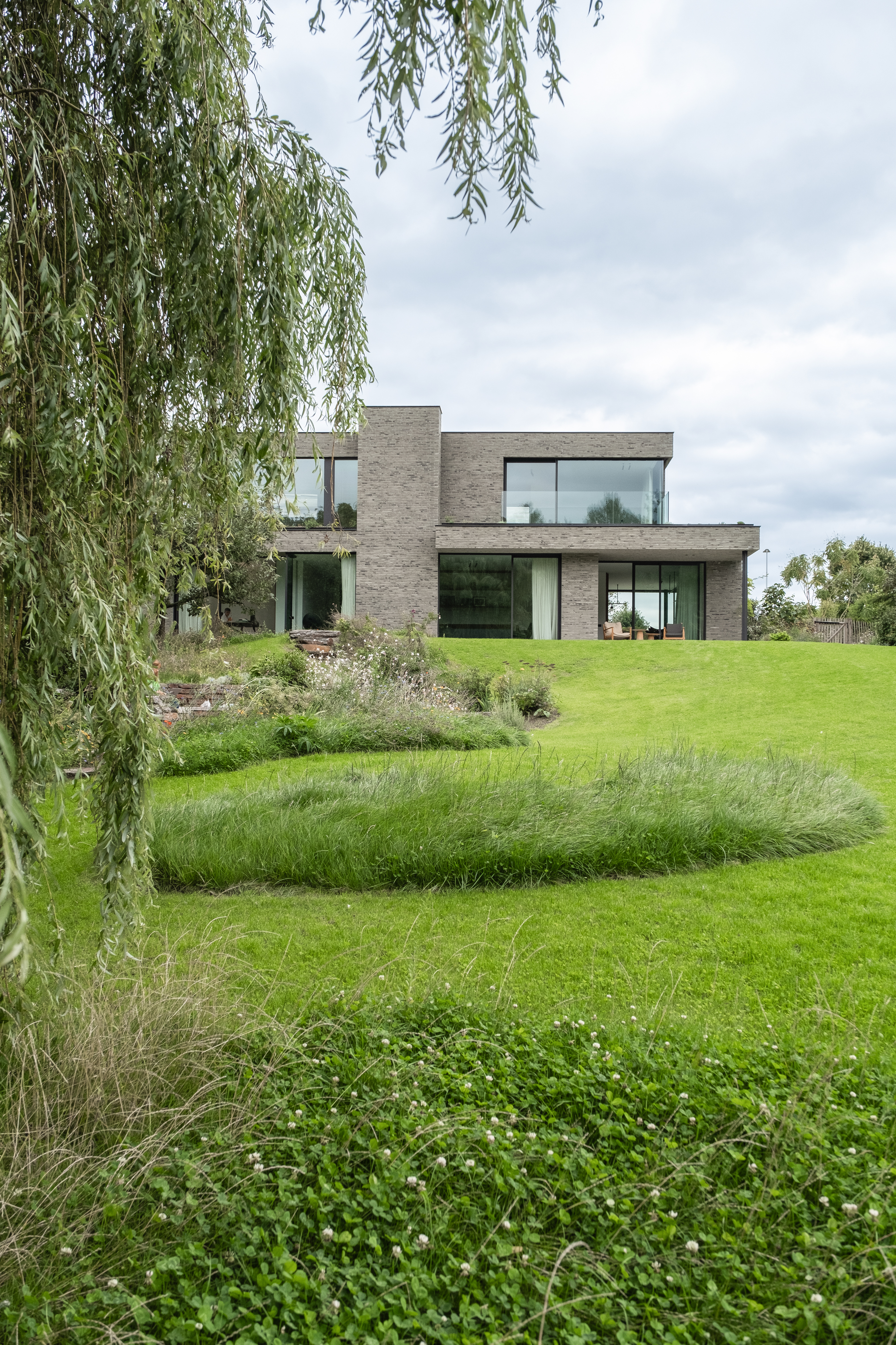La maison se trouve sur un terrain en pente qui descend jusqu'à la Lys à l'arrière. À l'avant, elle semble relativement statique. Avec un mur de briques faisant écran, le bâtiment se ferme sur la rue, en grande partie dissimulé par une végétation luxuriante. À l'exception d'une fenêtre au premier étage, il n'y a pratiquement aucune vue.