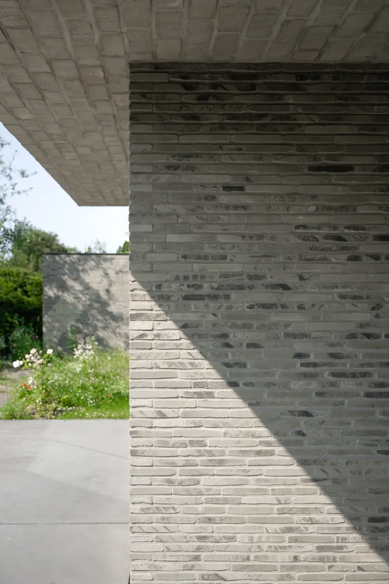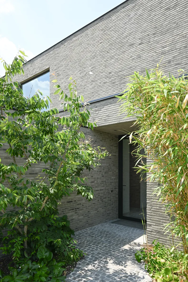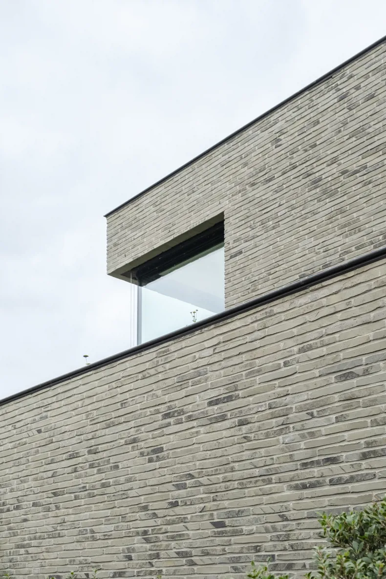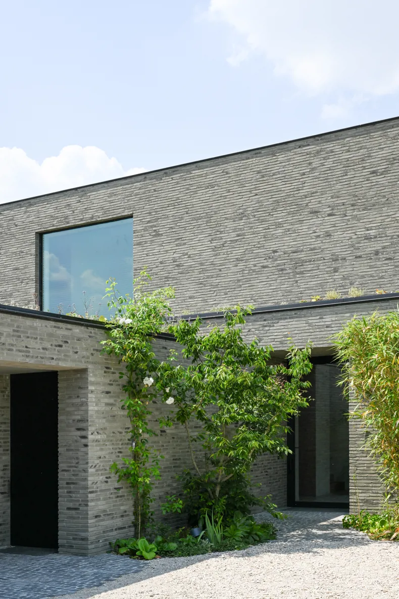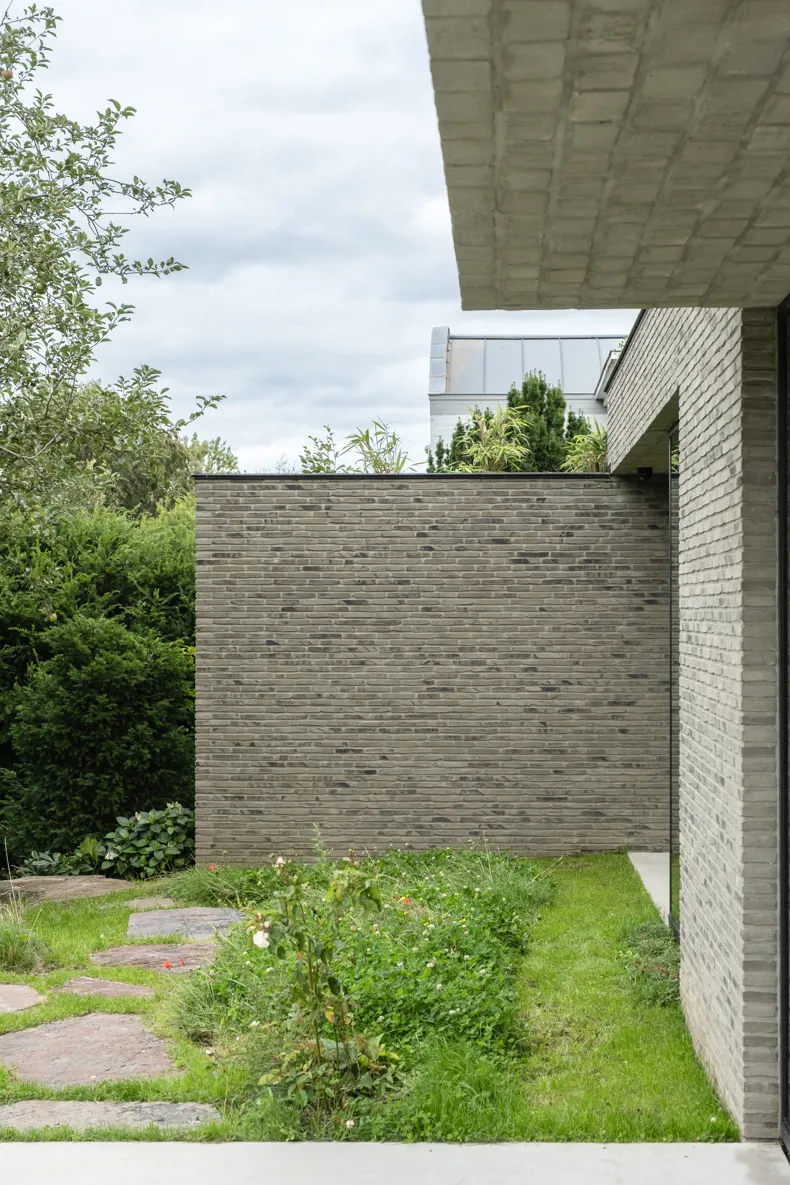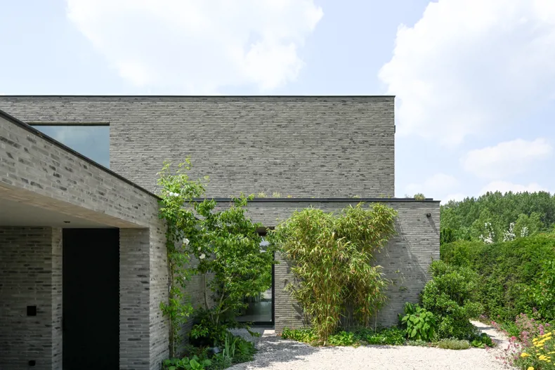 La nature sauvage contraste avec les lignes strictes du bâtiment. En même temps, elle s'intègre parfaitement. Avec ses briques gris-vert et ses volumes dynamiques, la maison se fond dans la verdure. Les volumes décalés rythment l'architecture et la superposent. La composition se traduit tantôt par de grands auvents qui créent des zones d'ombre et captent le soleil, tantôt par des espaces intimes où l'on peut s'attarder à l'extérieur. « Les façades ont été créées à partir de la fragmentation et de la fonctionnalité de la maison », explique l'architecte.
