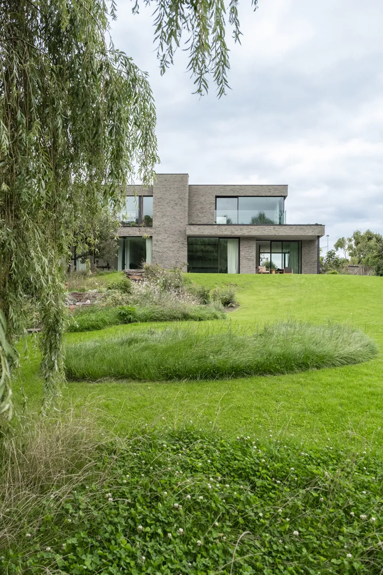 Même la porte d'entrée en verre est dissimulée derrière des arbustes. « L'idée était d'intégrer complètement la maison dans la nature », explique Bilquin. «Il ne fallait pas sentir de limites. À cette fin, nous avons travaillé en étroite collaboration avec l'architecte paysagiste Aldrik Heirman, qui a conçu une sorte de parc-jardin sauvage. À l'avant, le jardin est sauvage et couvert d'une végétation dense, tandis qu'à l'arrière, il est plus ouvert et les ondulations du terrain produisent un effet différent. La maison évolue en quelque sorte avec ce paysage changeant ».