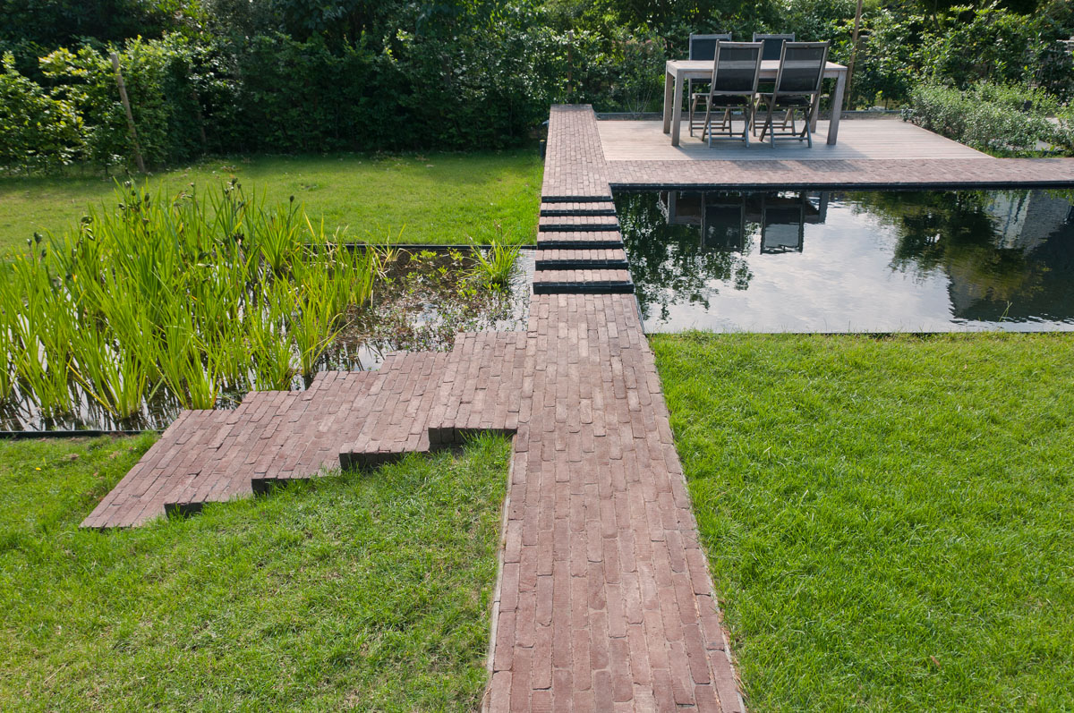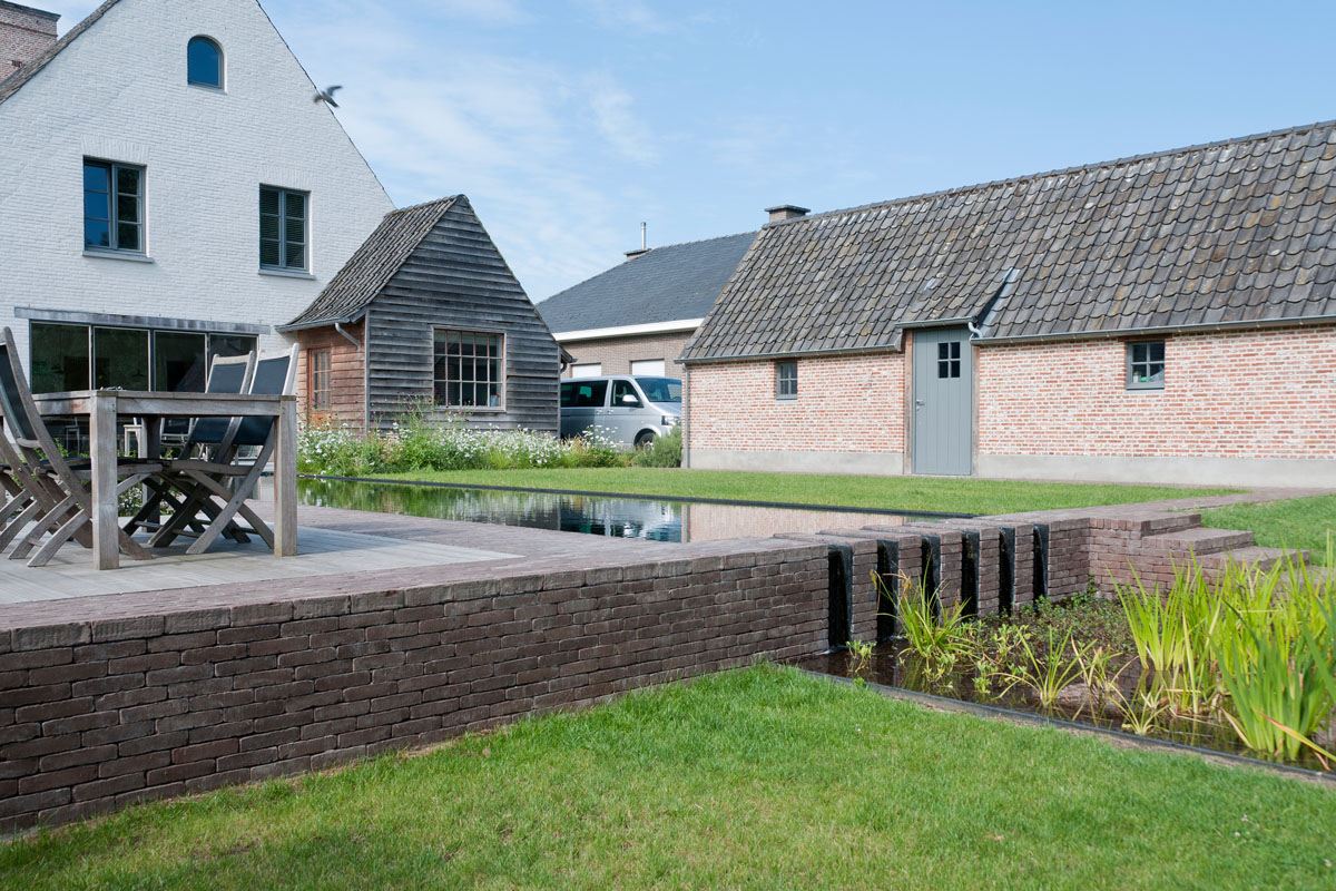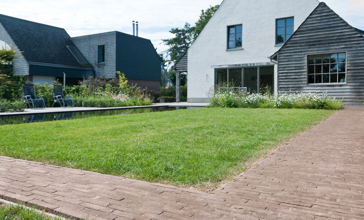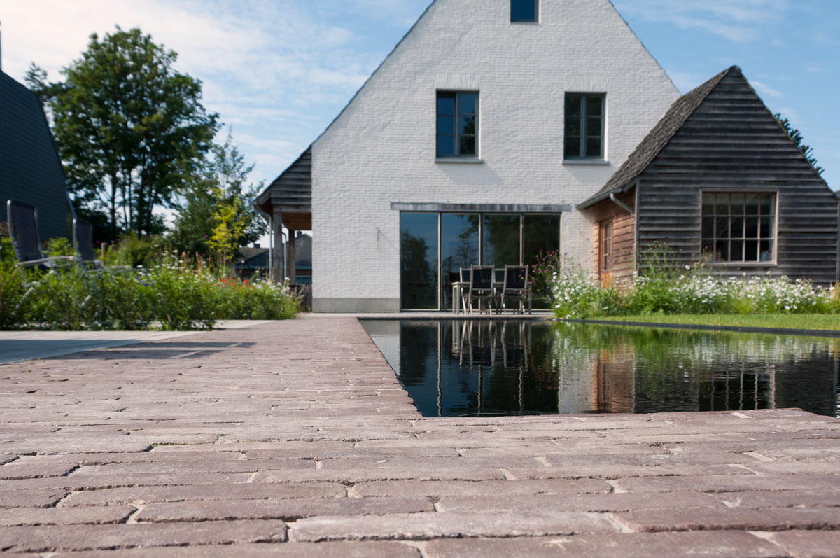 Les pavés en terre cuite SeptimA Châtain s'intègrent à la perfection dans l'ensemble en raison de leur superbe couleur à la patine naturelle. Facteurs de cohésion, ils adoucissent en outre les allées qui relient les différentes terrasses. La combinaison de ces pavés avec la pierre bleue ancienne et le bois dur renforce encore l'harmonie. La sélection soigneuse des plantations, en guise de touche finale, contribue autant à l'atmosphère chaleureuse qu'à la préservation de la splendeur naturelle du jardin d'origine.