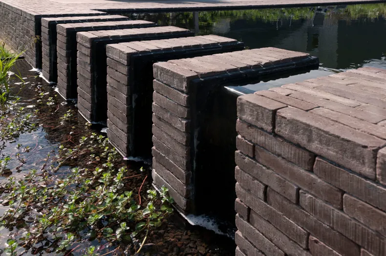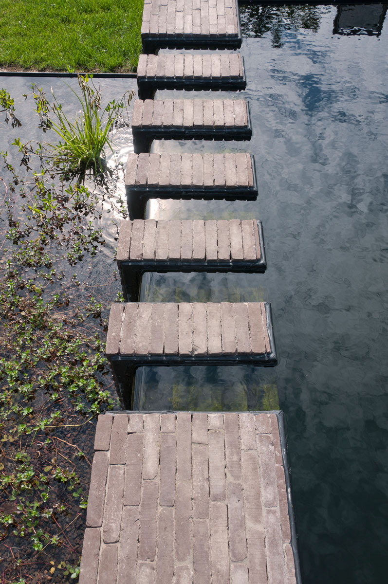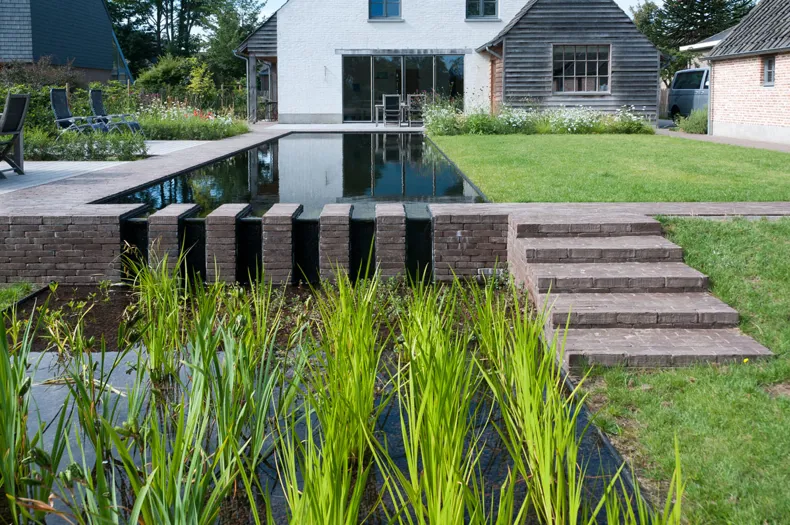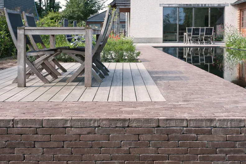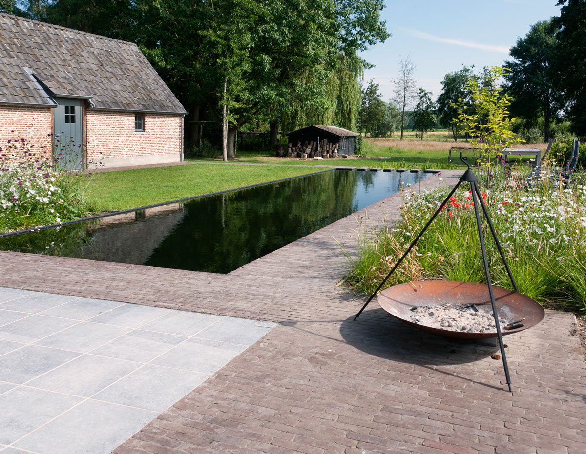 Les pavés en terre cuite SeptimA Châtain s'intègrent à la perfection dans l'ensemble en raison de leur superbe couleur à la patine naturelle. Facteurs de cohésion, ils adoucissent en outre les allées qui relient les différentes terrasses. La combinaison de ces pavés avec la pierre bleue ancienne et le bois dur renforce encore l'harmonie. La sélection soigneuse des plantations, en guise de touche finale, contribue autant à l'atmosphère chaleureuse qu'à la préservation de la splendeur naturelle du jardin d'origine.