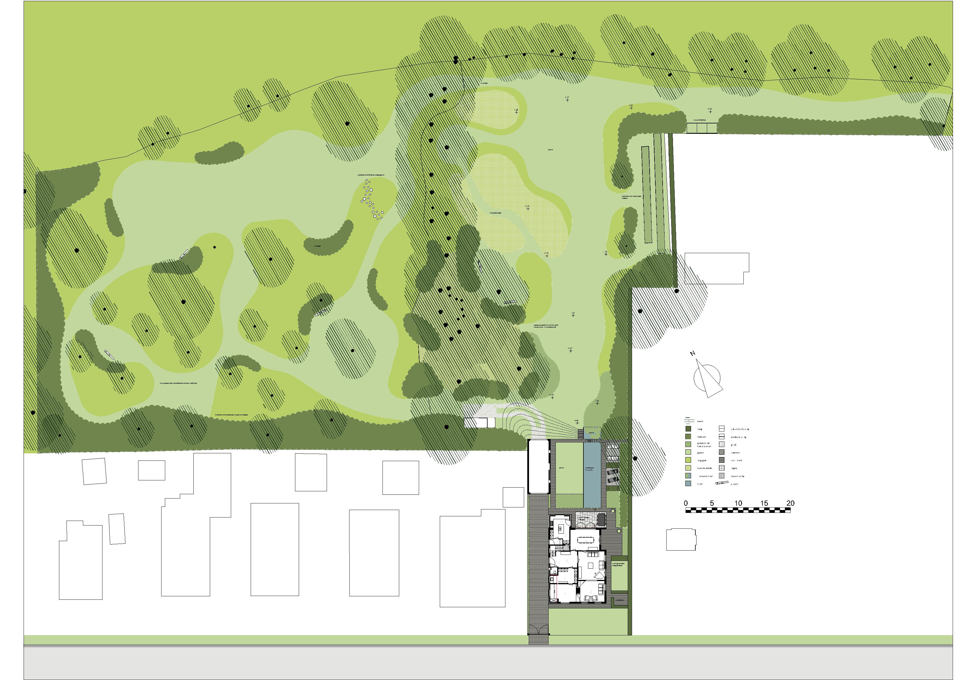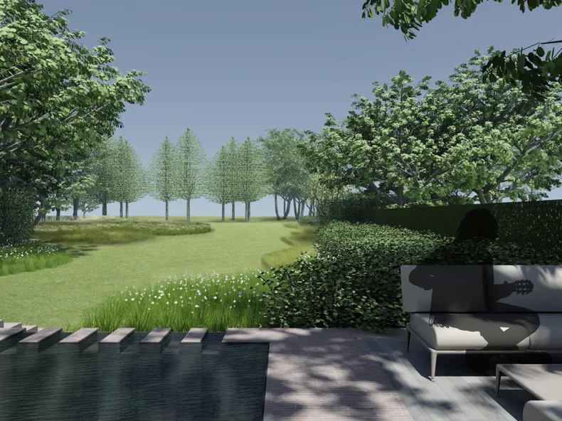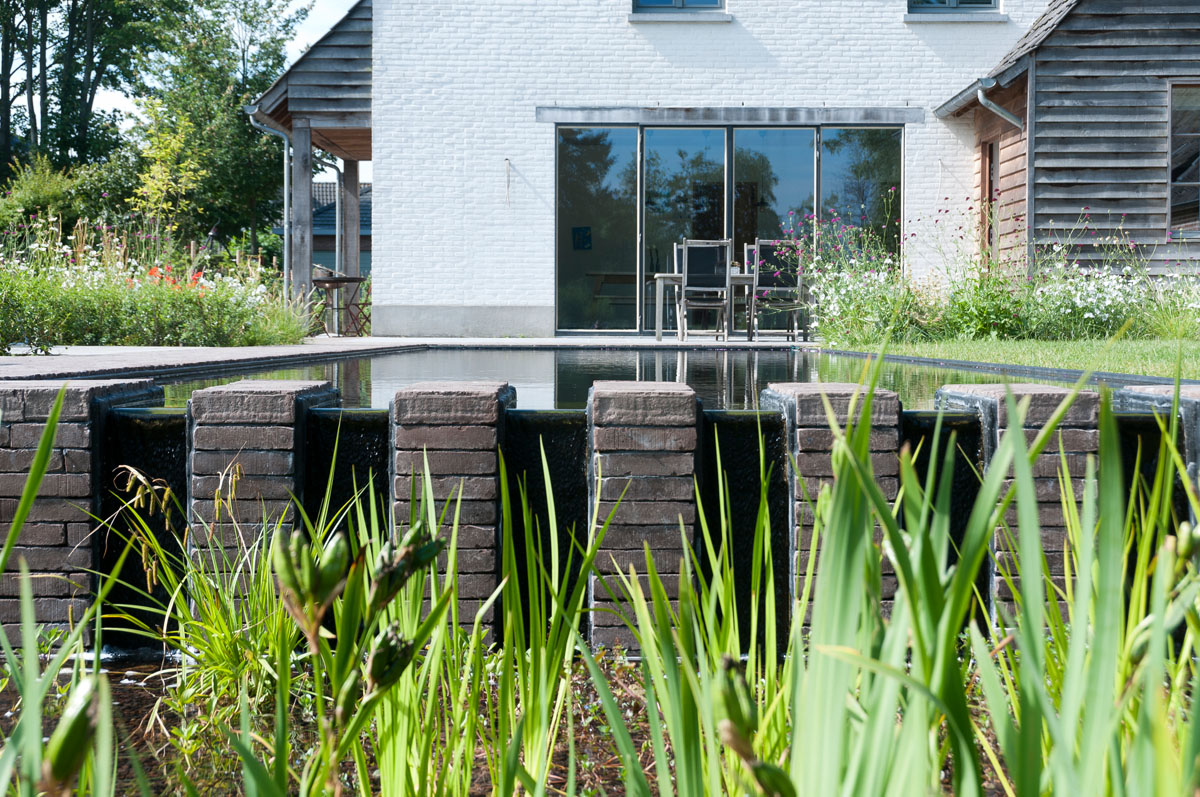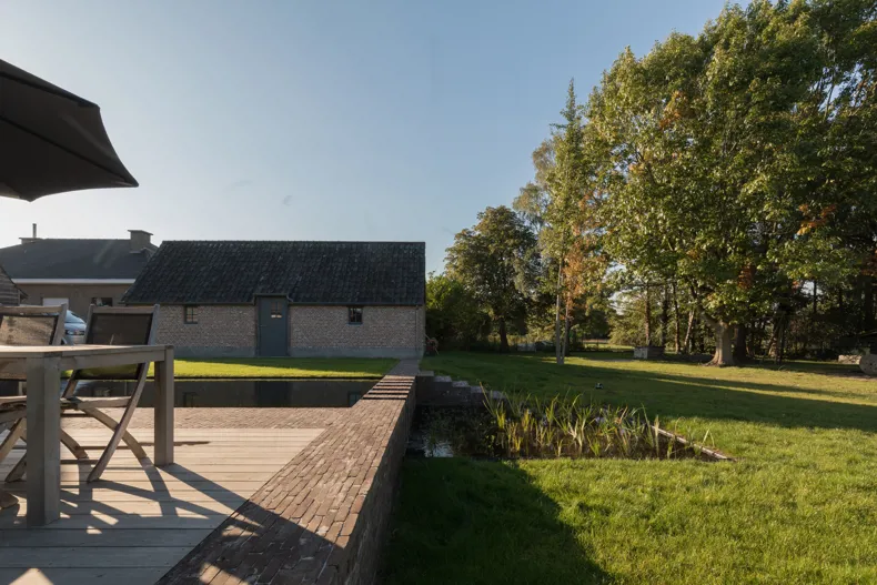Ainsi, le pourtour de l'habitation a été planté d'arbustes qui fleurissent et embaument au printemps. Des arbustes naturels comme (demander à Stefaan) ont également été disposés plus loin dans le jardin. L'étang de baignade est quant à lui entouré de graminées et de fleurs.