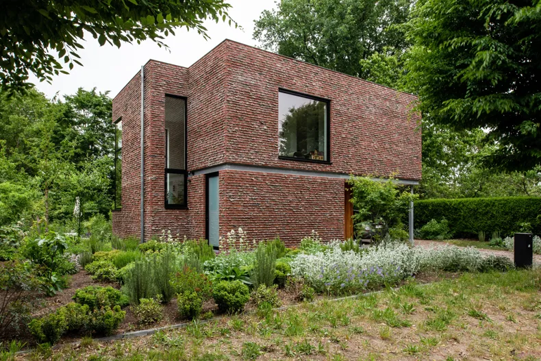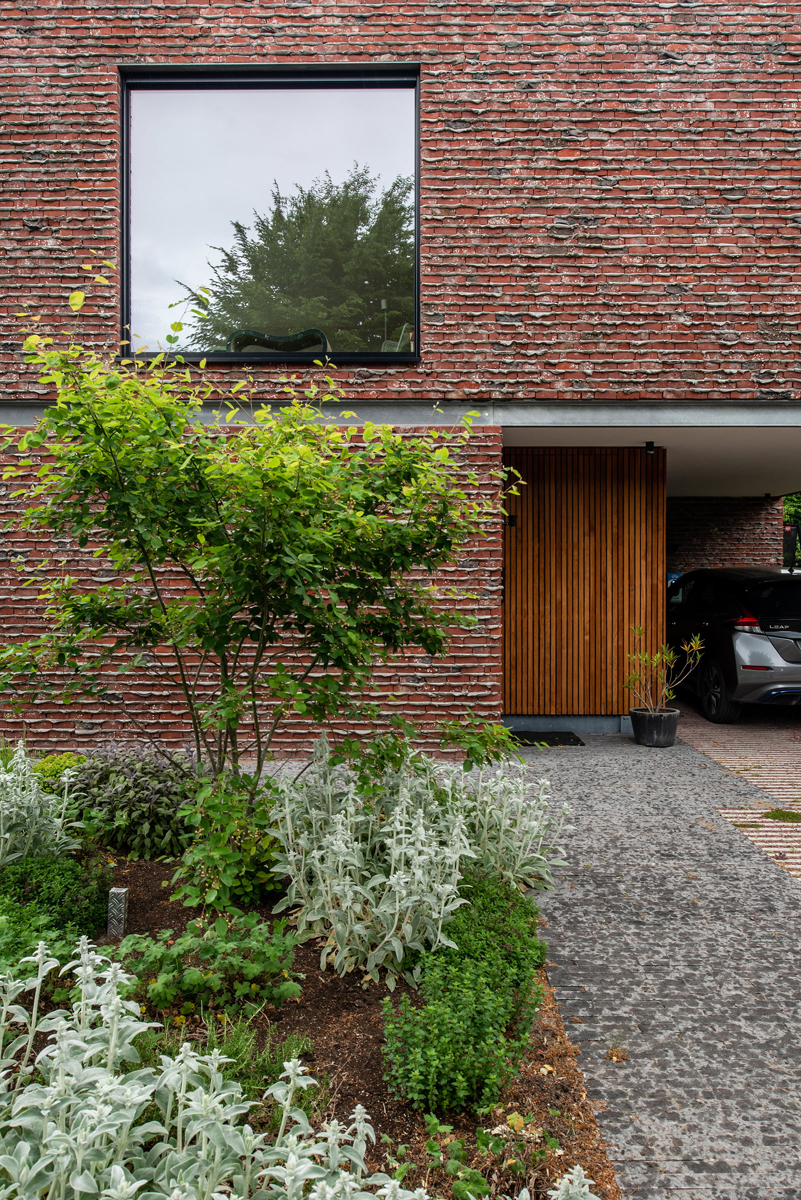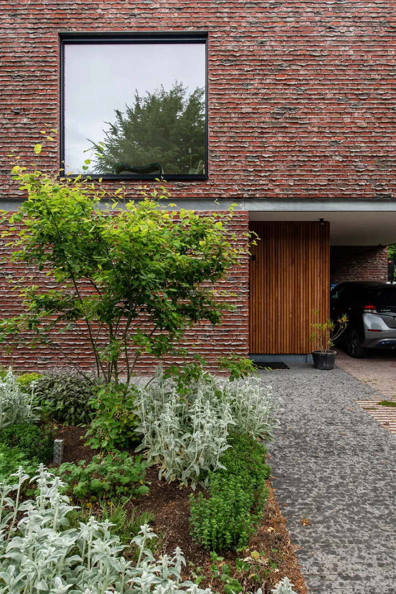 Veldbrand RougeLa maçonnerie de façade est exécutée avec une brique pure typique de l'Escaut (la seule encore disponible) mise en œuvre avec des saillies de mortier, ce qui lui donne un aspect brut et organique. De même, le choix a été fait de laisser apparents les linteaux d'acier au-dessus des grandes baies vitrées et du carport. Au fil du temps, l'extérieur acquerra sa propre patine, de sorte qu'il se fondra de plus en plus dans l'environnement et la verdure.