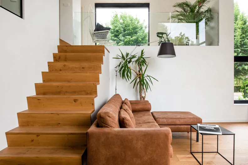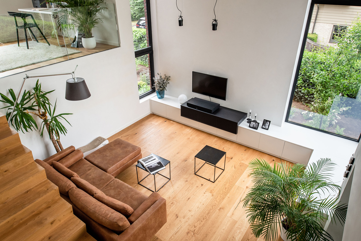 La maison est aménagée en demi-niveaux. La cuisine et la salle à manger se trouvent au rez-de-chaussée sur la façade arrière, le salon un demi-niveau plus haut et le bureau/l'espace de lecture au premier étage. La hauteur du plafond au-dessus du salon ouvre de larges vues depuis le coin lecture jusqu'à la cuisine tout à l'arrière. De cette façon, tous les espaces de vie sont interconnectés, tout en ayant leur propre atmosphère et leur relation unique avec le jardin/la rue en fonction de leur position, de la hauteur du plafond et du revêtement de sol. La circulation dans l’habitation offre différentes vues et perspectives sur l'extérieur. Les chambres et la salle de bain, situées ensemble au premier étage, sont accessibles par l'escalier en bois qui longe le vide du salon et du bureau.