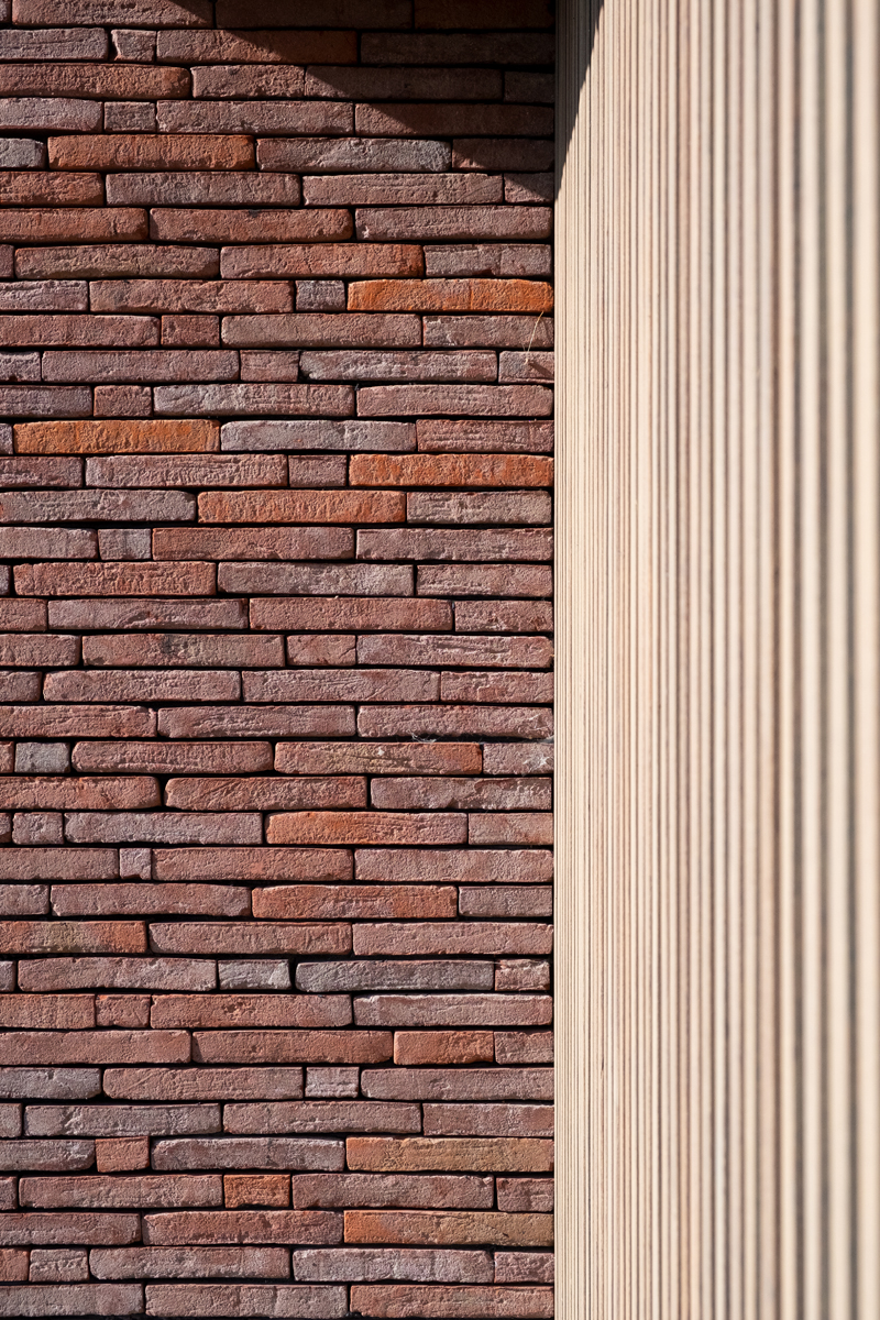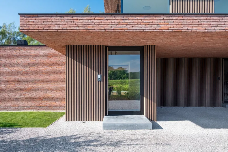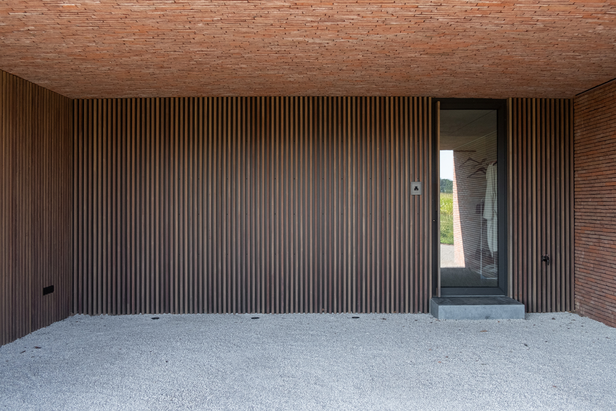 Afin de permettre à l'architecture de s’exprimer à travers la matérialité, CAS a décidé d'étendre le langage formel de manière cohérente dans toute la maison. Des plaquettes de Linea 3011 ont ainsi été réalisées et placées sur la face inférieure des surplombs. « Les plaquettes de parement permettent de réaliser de fins détails. En habillant les parties couvertes avec un seul et même matériau, on accentue la volumétrie. Et en les appliquant de façon aléatoire, on n'obtient pas un joint nuancé. Il en aurait résultéune ligne visuellement droite avec l'auvent en ligne droite et l'auvent perpendiculaire. Tous les volumes sont maintenant joliment imbriqués. Et le souci du détail est présent, comme dans le cas des colonnes de la façade. Ainsi, la brique de parement affiche tous ses atouts et souligne ainsi la puissance de l'architecture. »