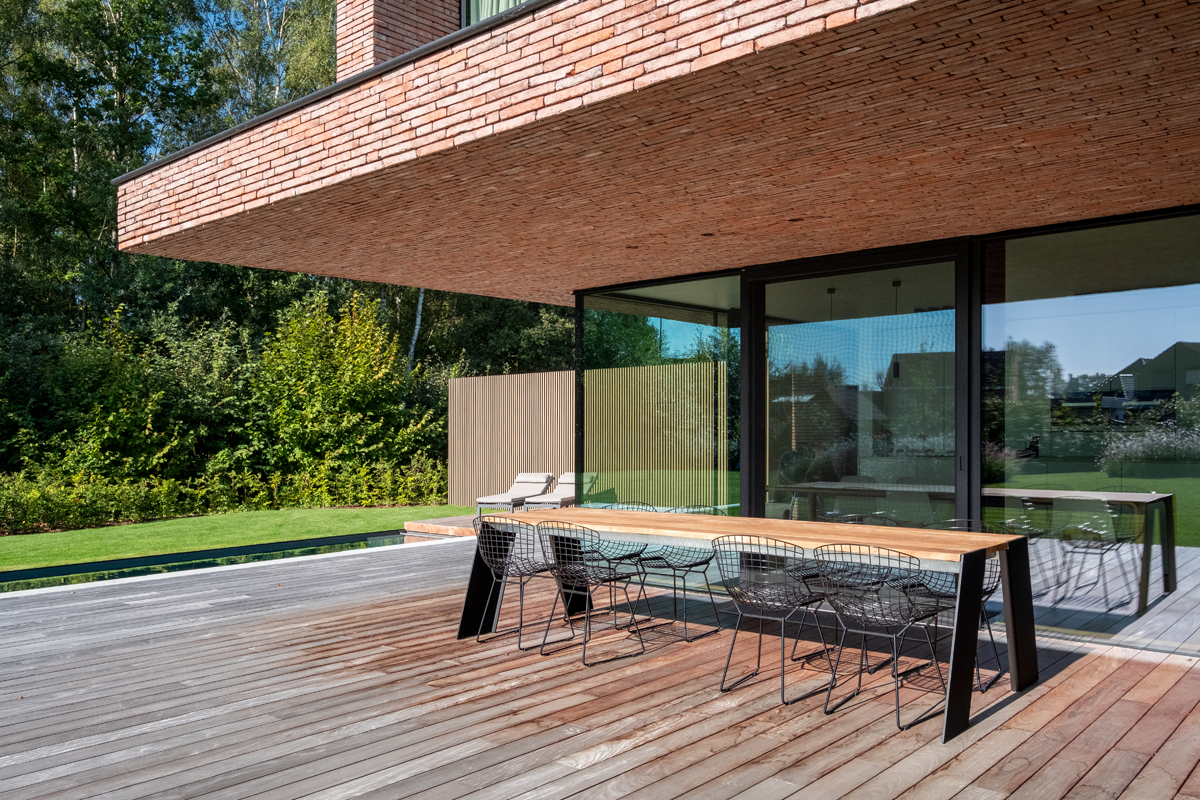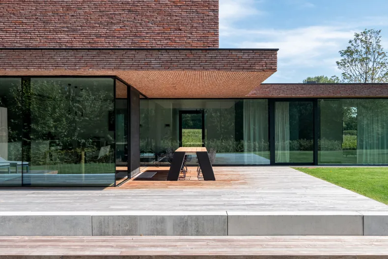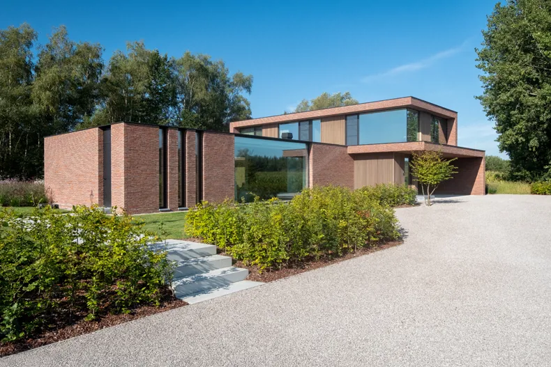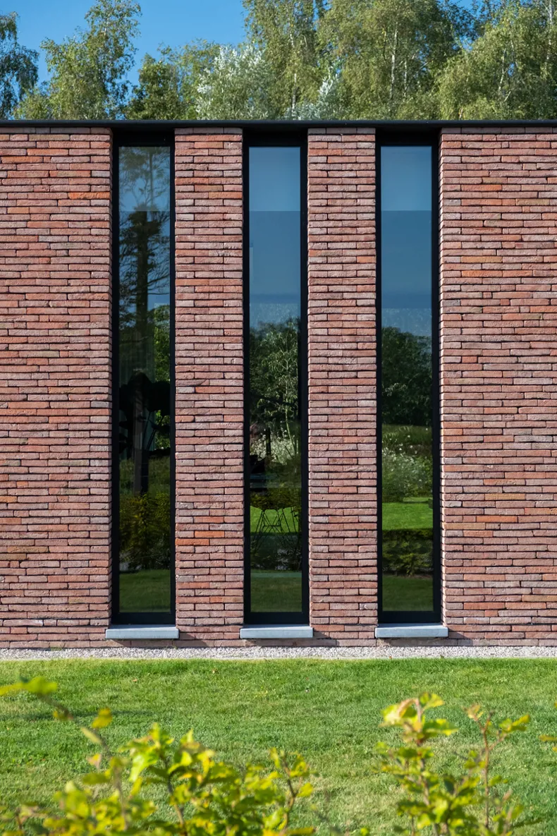 CAS, qui a l'expérience des projets situés hors zone, a insisté dès le départ sur une architecture contemporaine. Mais en respectant l'environnement naturel. Pieter-Jan Leenknecht, CAS : « Une conception basée sur les lois de la nature implique que la forme et la matérialité d'une maison ne peuvent être en opposition avec la nature. Un volume en crépi blanc aurait été inapproprié à cet endroit. Nous avons recherché une palette de matériaux équilibrée, composée de matériaux naturels. Nous sommes rapidement arrivés à une combinaison de béton, de bois et de brique. Les grandes fenêtres maintiennent la sveltesse de l'ensemble et font entrer la nature à l'avant et à l'arrière. Pour soutenir la sobriété de l'architecture et permettre en même temps au bâtiment de se fondre dans la nature, nous avons opté pour une brique mince de couleur brun-rouge. Linea 3011 n'est pas une brique ordinaire mais une brique fine, sablée, nuancée. Nous ne l'avons pas jointoyée de manière traditionnelle, mais avons utilisé une maçonnerie à joint mince dans un appareillage aléatoire. Grâce au mortier gris foncé appliqué en retrait, chaque brique est mise en avant. De cette façon, nous avons pu accentuer encore mieux le jeu de lignes de l'architecture à travers la maçonnerie. »